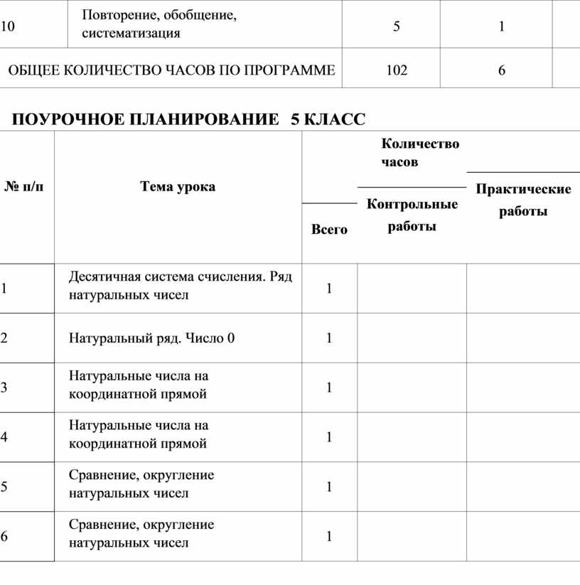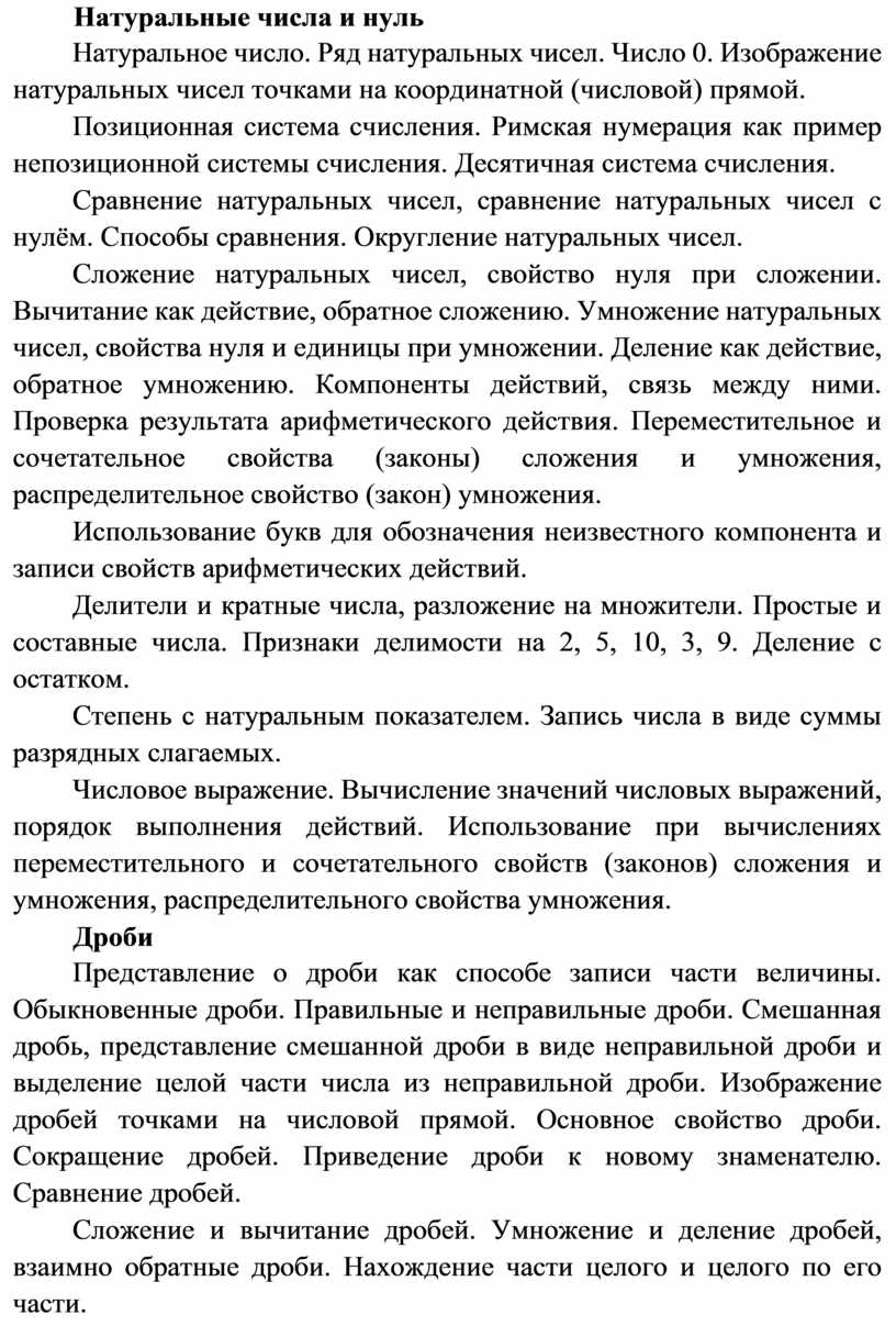 Изучение арифметического материала начинается со систематизации и развития знаний о натуральных числах, полученных на уровне начального общего образования. При этом совершенствование вычислительной техники и формирование новых теоретических знаний сочетается с развитием вычислительной культуры, в частности с обучением простейшим приёмам прикидки и оценки результатов вычислений. Изучение натуральных чисел продолжается в 6 классе знакомством с начальными понятиями теории делимости.