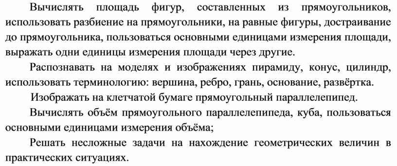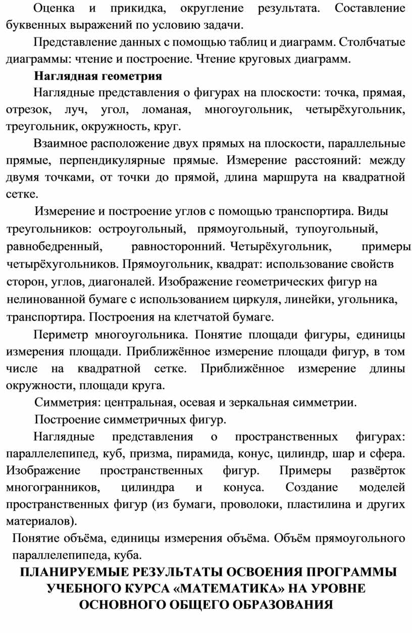 В программе учебного курса «Математика» представлена наглядная геометрия, направленная на развитие образного мышления, пространственного воображения, изобразительных умений. Это важный этап в изучении геометрии, который осуществляется на наглядно-практическом уровне, опирается на наглядно-образное мышление обучающихся. Большая роль отводится практической деятельности, опыту, эксперименту, моделированию. Обучающиеся знакомятся с геометрическими фигурами на плоскости и в пространстве, с их простейшими конфигурациями, учатся изображать их на нелинованной и клетчатой бумаге, рассматривают их простейшие свойства. В процессе изучения наглядной геометрии знания, полученные обучающимися на уровне начального общего образования, систематизируются и расширяются.