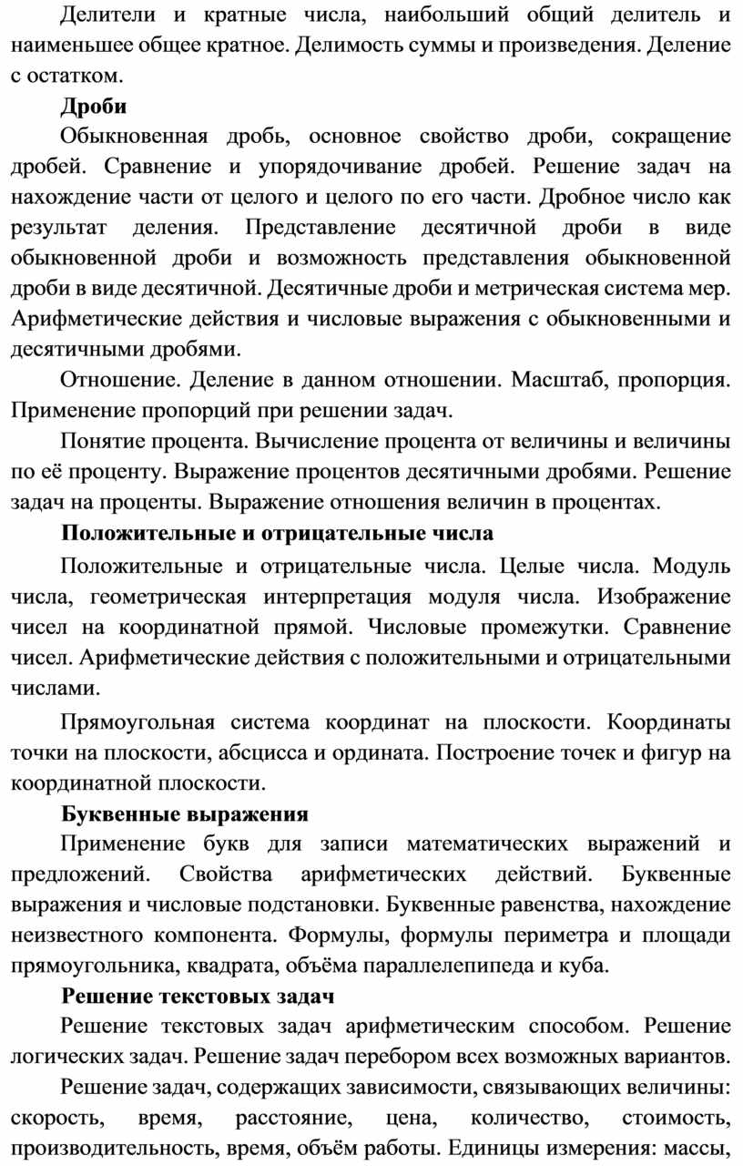 Основные линии содержания курса математики в 5–6 классах – арифметическая и геометрическая, которые развиваются параллельно, каждая в соответствии с собственной логикой, однако, не независимо одна от другой, а в тесном контакте и взаимодействии. Также в курсе математики происходит знакомство с элементами алгебры и описательной статистики.