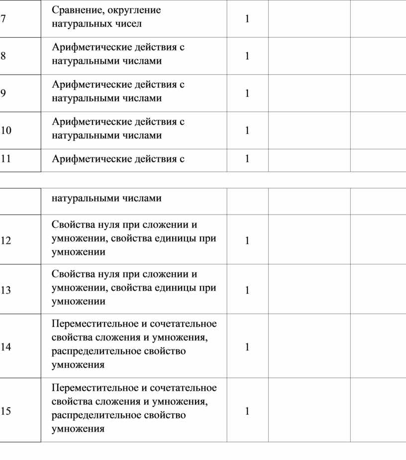 Сложение натуральных чисел, свойство нуля при сложении. Вычитание как действие, обратное сложению. Умножение натуральных чисел, свойства нуля и единицы при умножении. Деление как действие, обратное умножению. Компоненты действий, связь между ними. Проверка результата арифметического действия. Переместительное и сочетательное свойства (законы) сложения и умножения, распределительное свойство (закон) умножения.