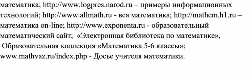 Образовательная коллекция «Математика 5-6 классы»; www.mathvaz.ru/index.php - Досье учителя математики.