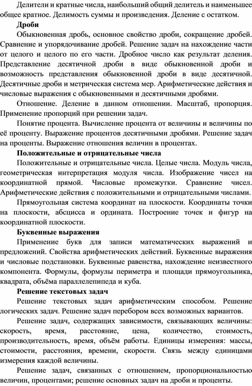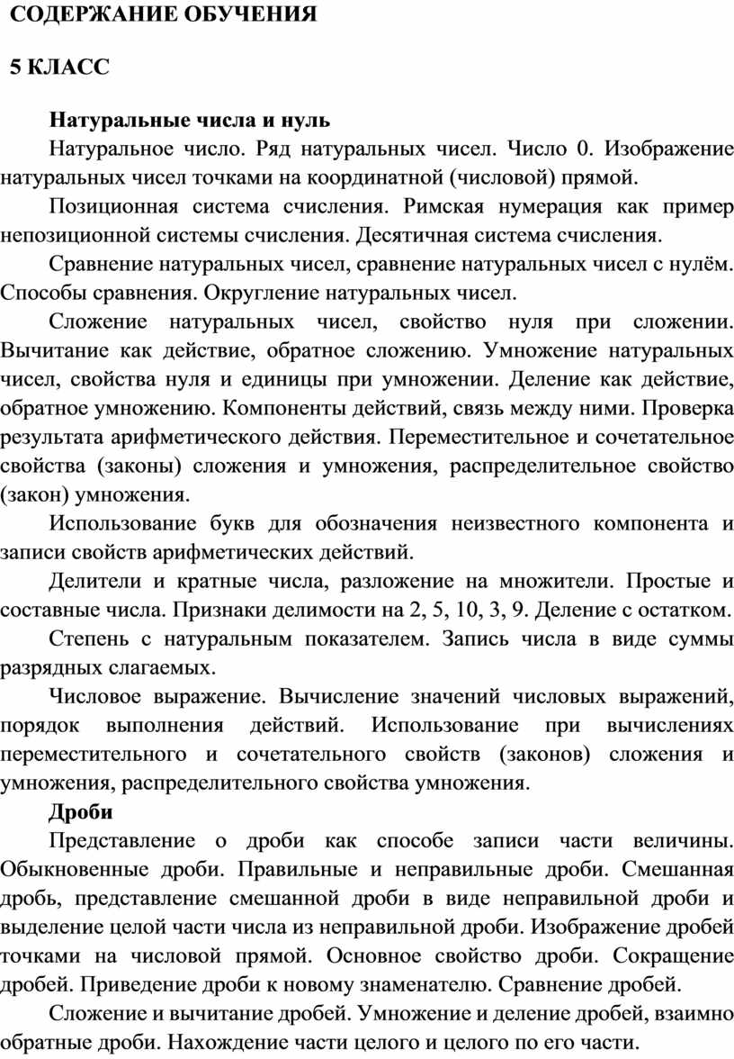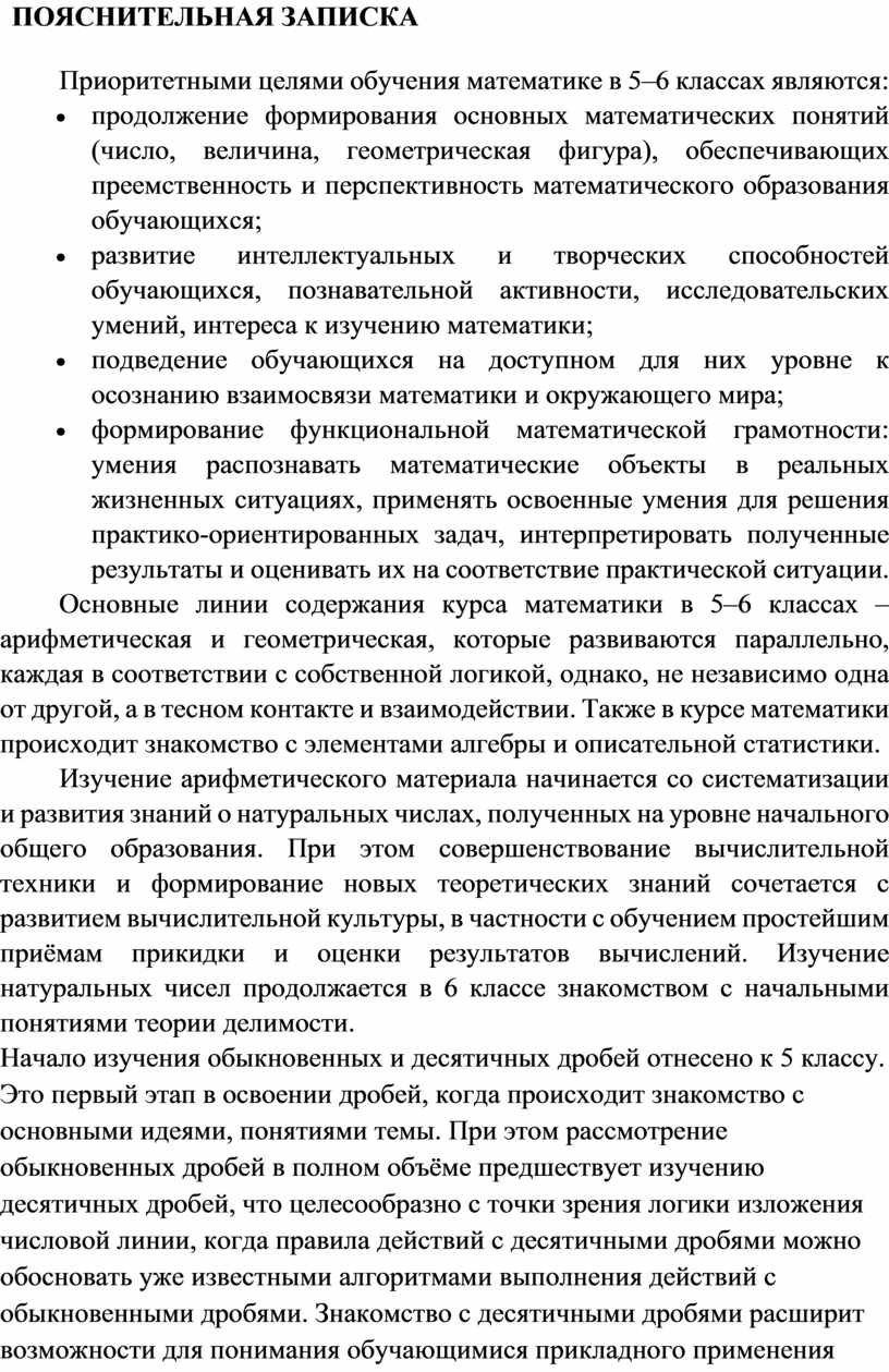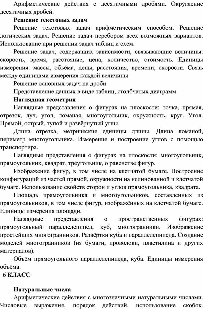 Согласно учебному плану в 5–6 классах изучается интегрированный предмет «Математика», который включает арифметический материал и наглядную геометрию, а также пропедевтические сведения из алгебры, элементы логики и начала описательной статистики.