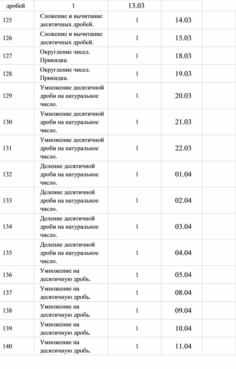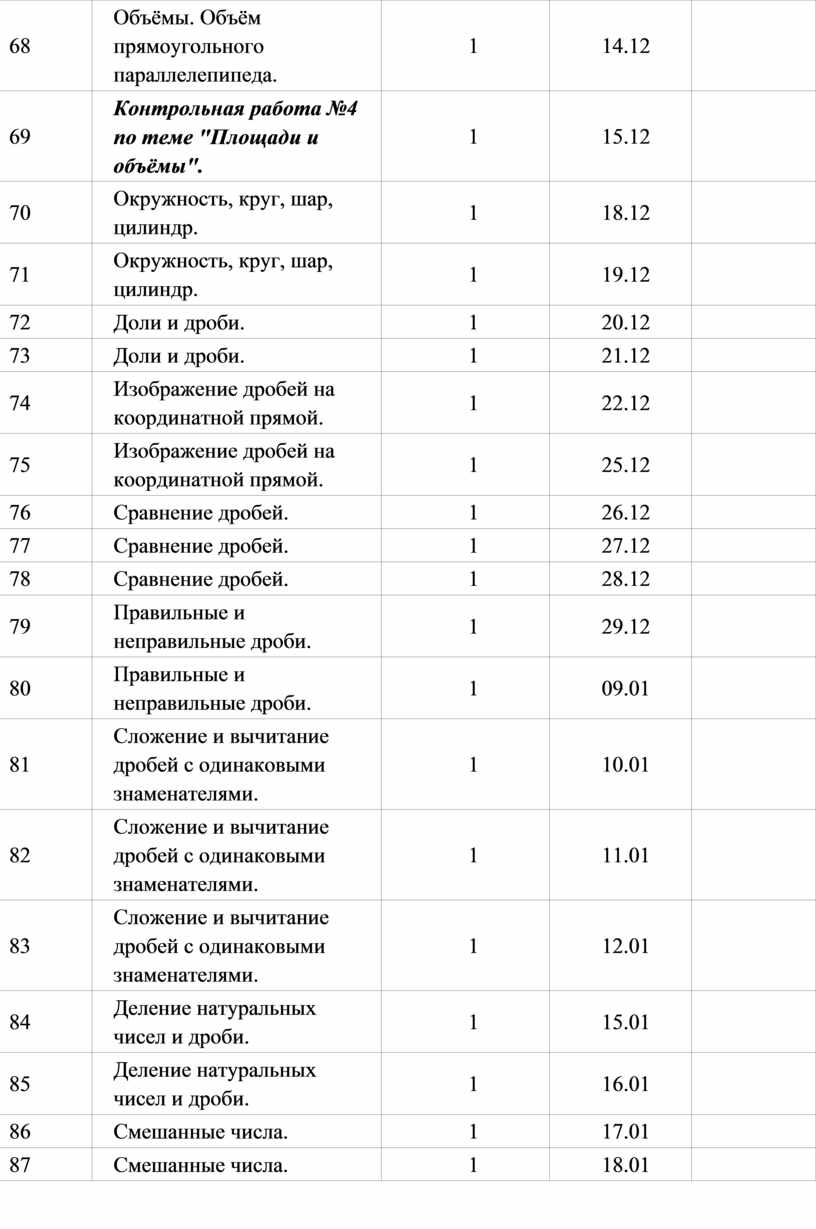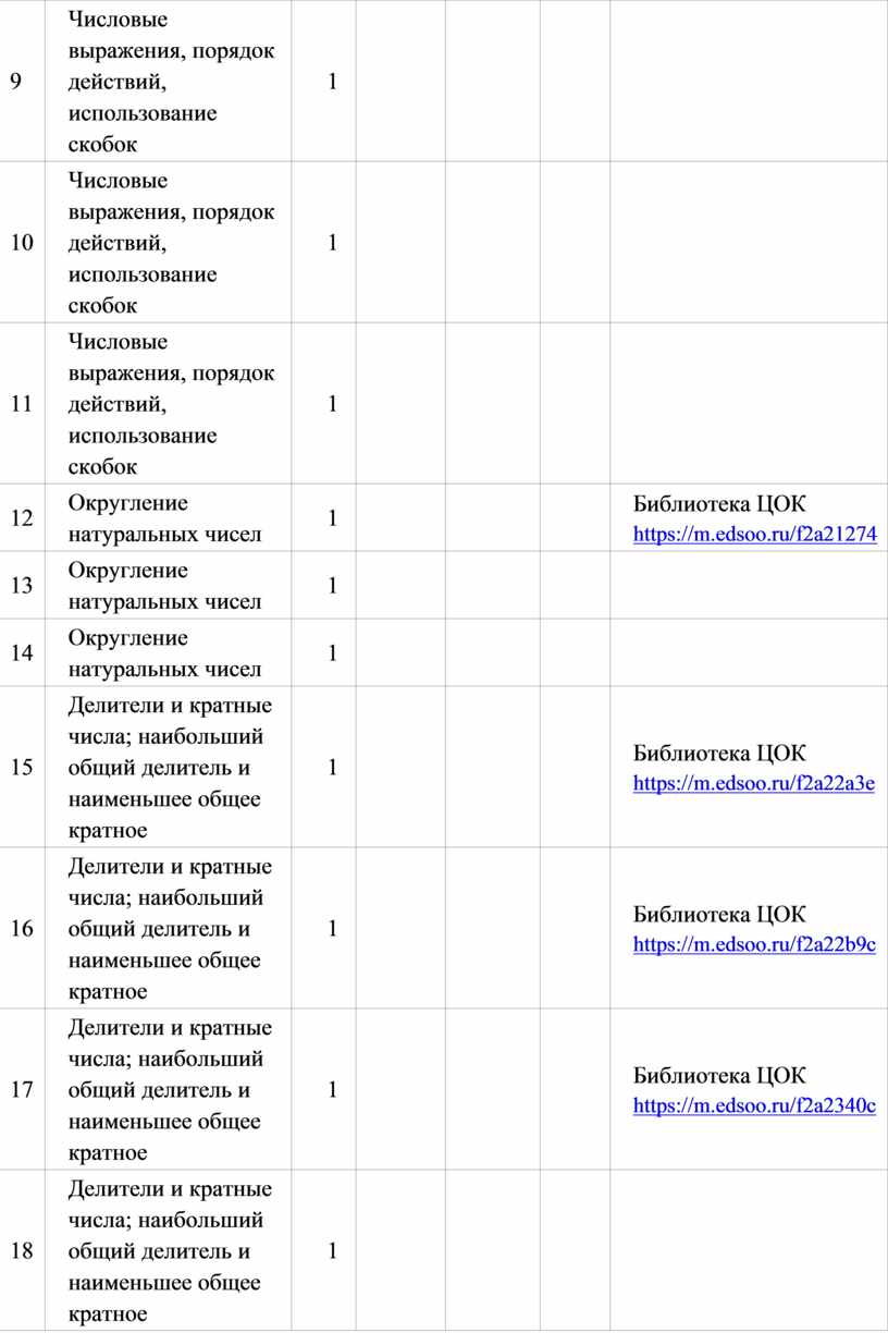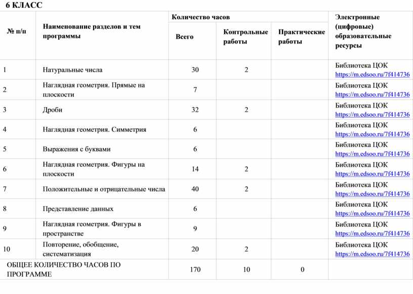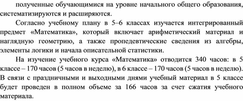 На изучение учебного курса «Математика» отводится 340 часов: в 5 классе – 170 часов (5 часов в неделю), в 6 классе – 170 часов (5 часов в неделю). В связи с праздничными и выходными днями учебный материал в 5 классе будет проведен в полном объеме за 166 часов за счет сжатия учебного материала.