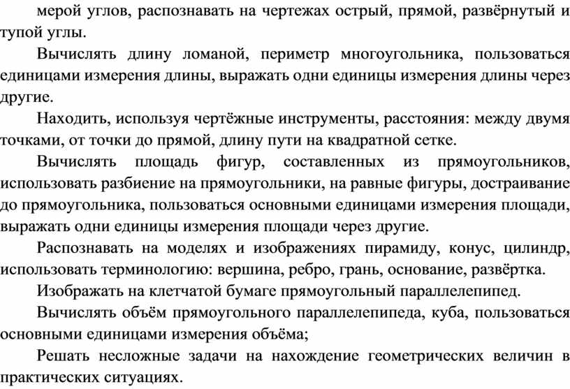 В программе учебного курса «Математика» представлена наглядная геометрия, направленная на развитие образного мышления, пространственного воображения, изобразительных умений. Это важный этап в изучении геометрии, который осуществляется на наглядно-практическом уровне, опирается на наглядно-образное мышление обучающихся. Большая роль отводится практической деятельности, опыту, эксперименту, моделированию. Обучающиеся знакомятся с геометрическими фигурами на плоскости и в пространстве, с их простейшими конфигурациями, учатся изображать их на нелинованной и клетчатой бумаге, рассматривают их простейшие свойства. В процессе изучения наглядной геометрии знания, полученные обучающимися на уровне начального общего образования, систематизируются и расширяются.