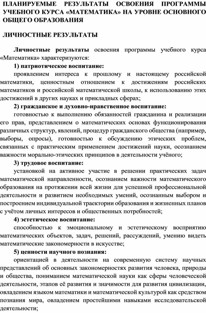 ПЛАНИРУЕМЫЕ РЕЗУЛЬТАТЫ ОСВОЕНИЯ ПРОГРАММЫ УЧЕБНОГО КУРСА «МАТЕМАТИКА» НА УРОВНЕ ОСНОВНОГО ОБЩЕГО ОБРАЗОВАНИЯ