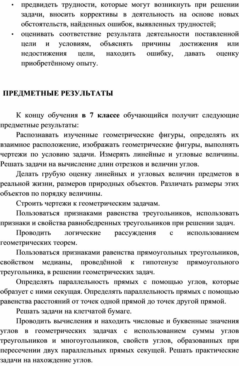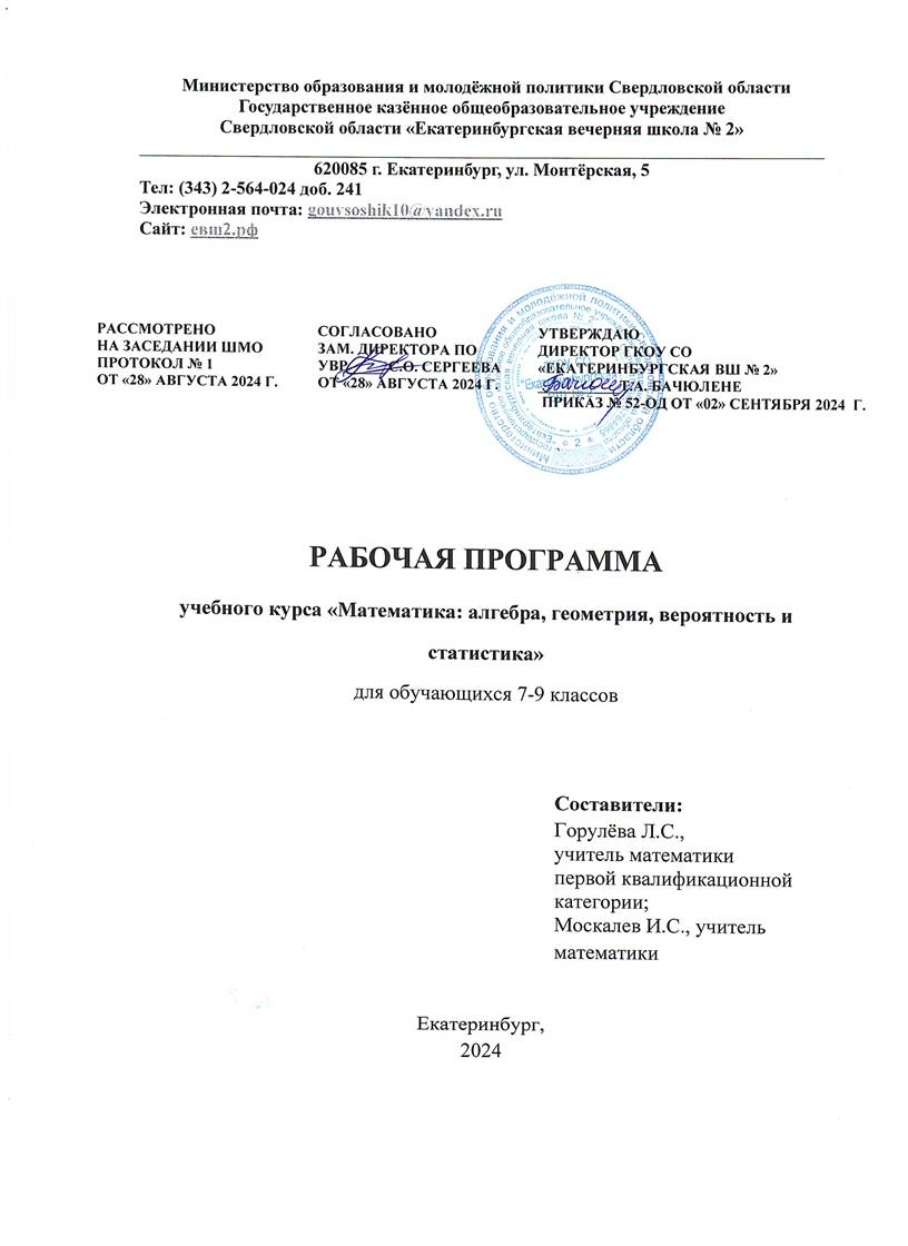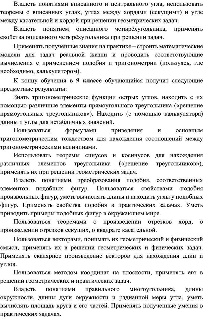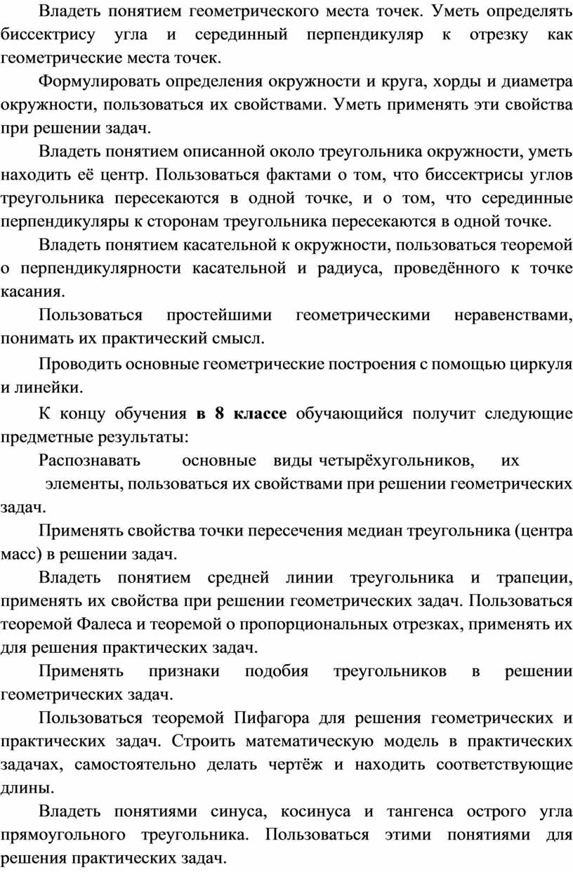Приоритетными целями обучения математике в 7–9 классах являются: формирование центральных математических понятий (число, величина, геометрическая фигура, переменная, вероятность, функция), обеспечивающих преемственность и перспективность математического образования обучающихся; подведение обучающихся на доступном для них уровне к осознанию взаимосвязи математики и окружающего мира, понимание математики как части общей культуры человечества; развитие интеллектуальных и творческих способностей обучающихся, познавательной активности, исследовательских умений, критичности мышления, интереса к изучению математики; формирование функциональной математической грамотности: умения распознавать проявления математических понятий, объектов и закономерностей в реальных жизненных ситуациях и при изучении других учебных предметов, проявления зависимостей и закономерностей, формулировать их на языке математики и создавать математические модели, применять освоенный математический аппарат для решения практикоориентированных задач, интерпретировать и оценивать полученные результаты.