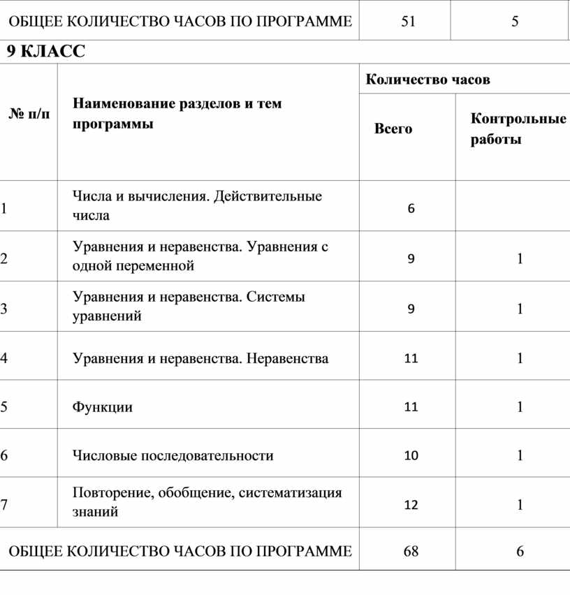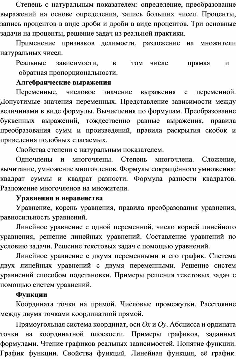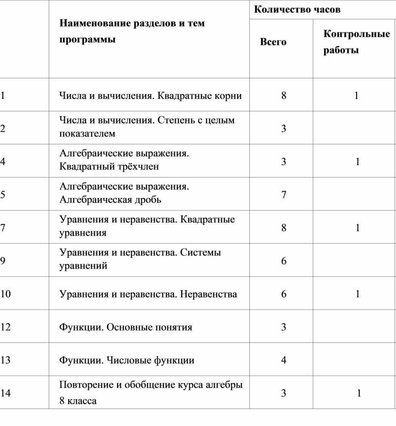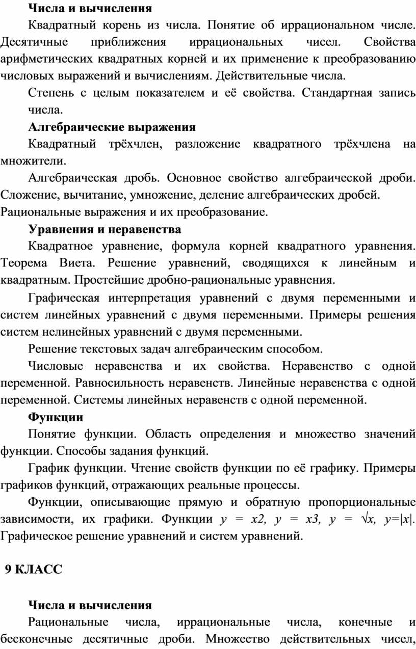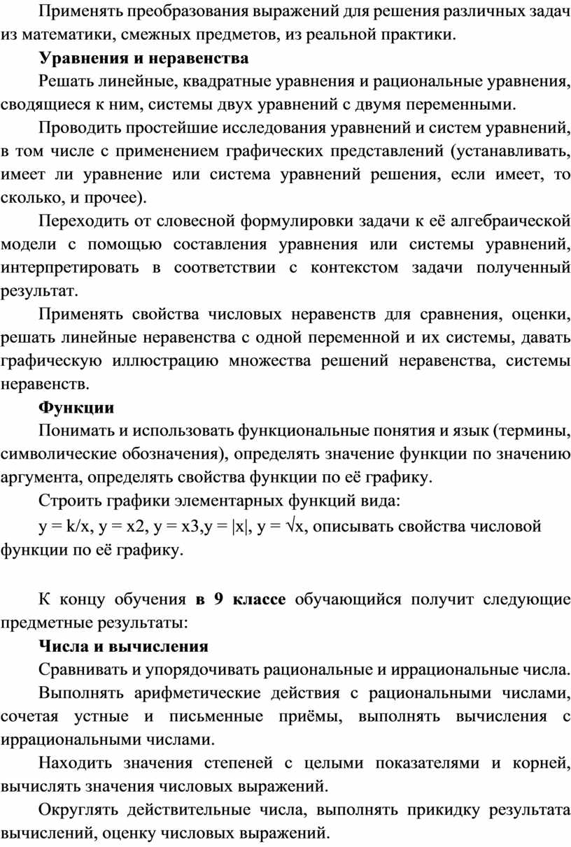 Согласно учебному плану в 7–9 классах изучается учебный курс «Алгебра», который включает следующие основные разделы содержания: «Числа и вычисления», «Алгебраические выражения», «Уравнения и неравенства», «Функции».