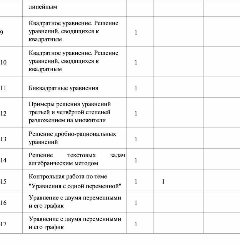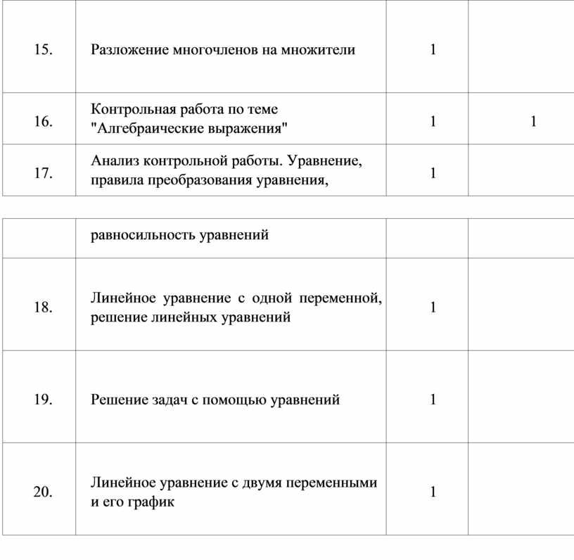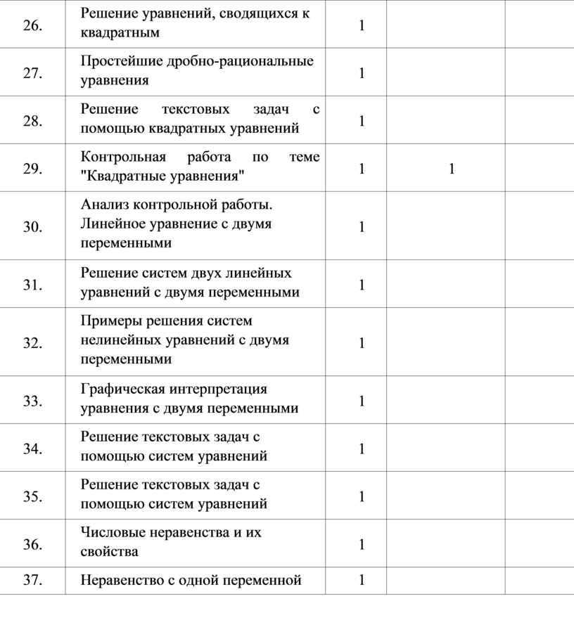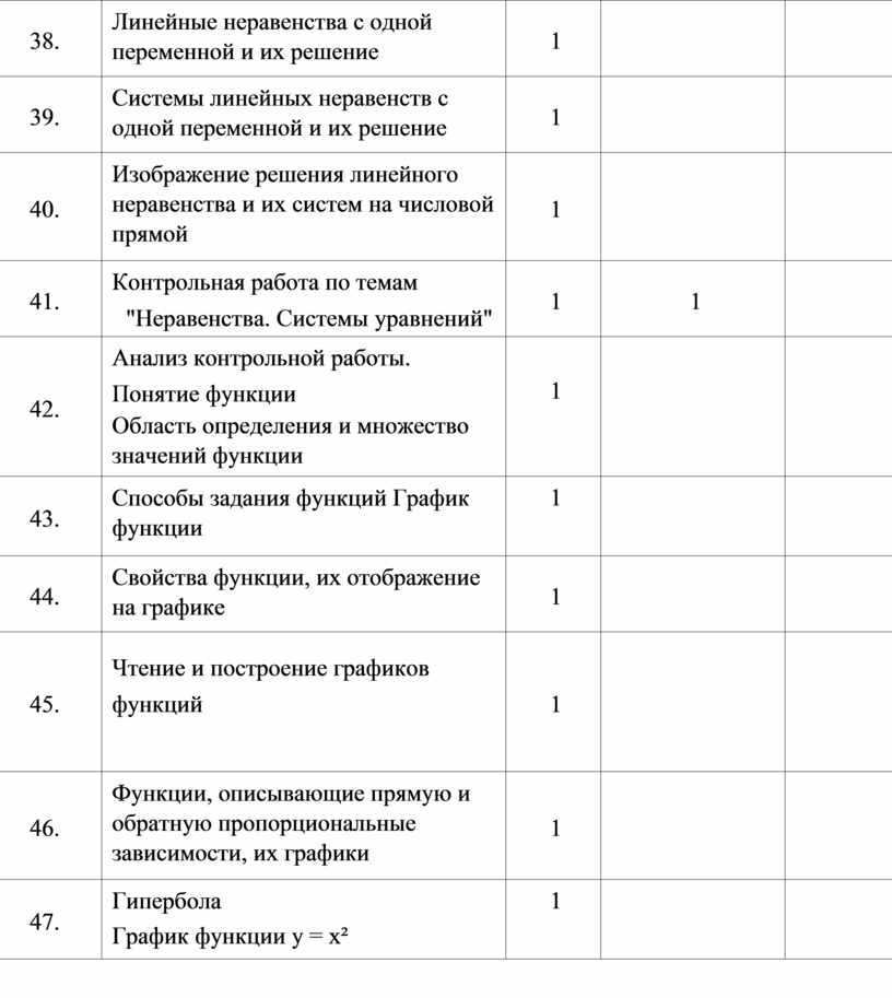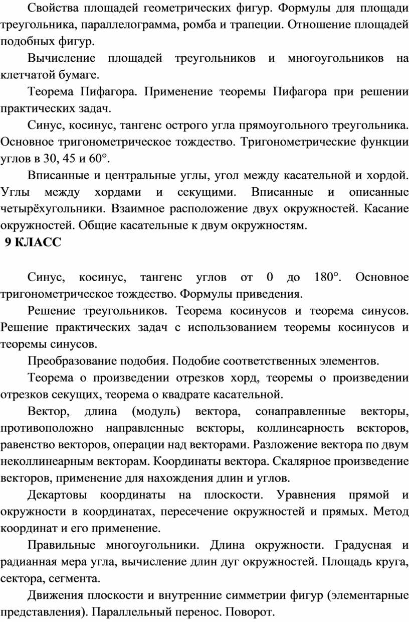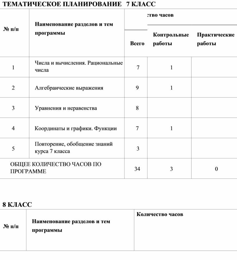 Согласно учебному плану в 7–9 классах изучается учебный курс «Алгебра», который включает следующие основные разделы содержания: «Числа и вычисления», «Алгебраические выражения», «Уравнения и неравенства», «Функции».