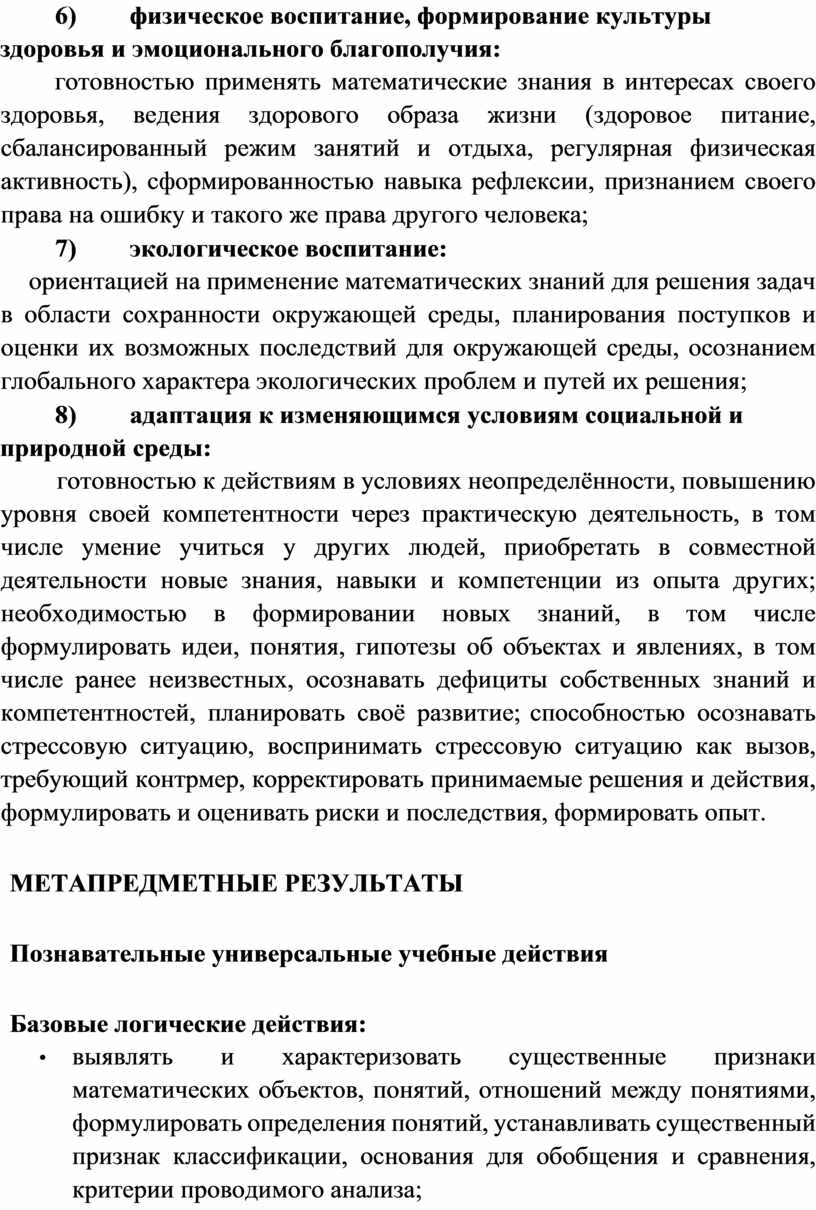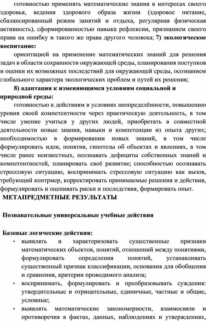 готовностью применять математические знания в интересах своего здоровья, ведения здорового образа жизни (здоровое питание, сбалансированный режим занятий и отдыха, регулярная физическая активность), сформированностью навыка рефлексии, признанием своего права на ошибку и такого же права другого человека; 7) экологическое воспитание: