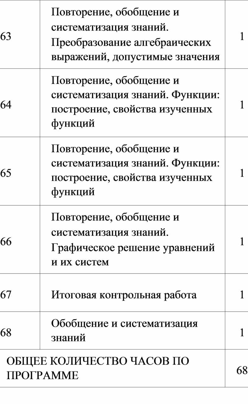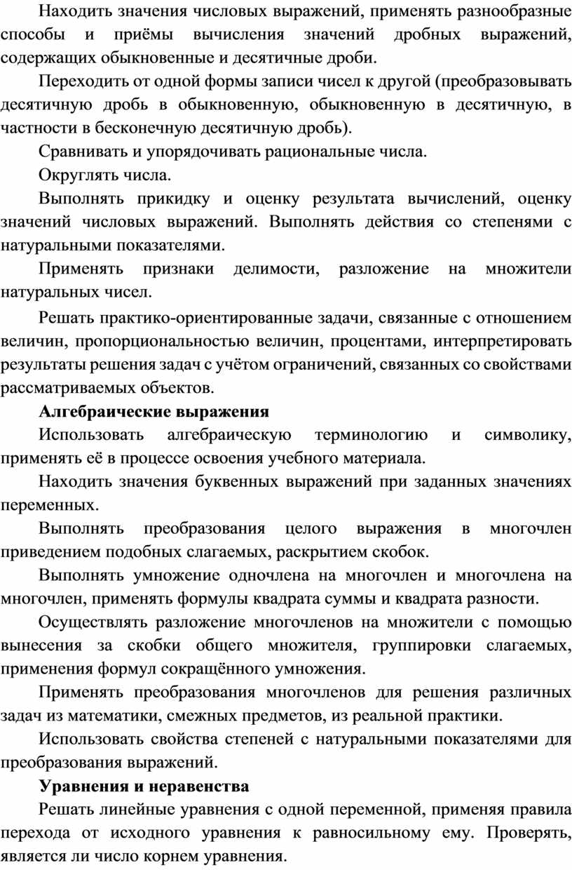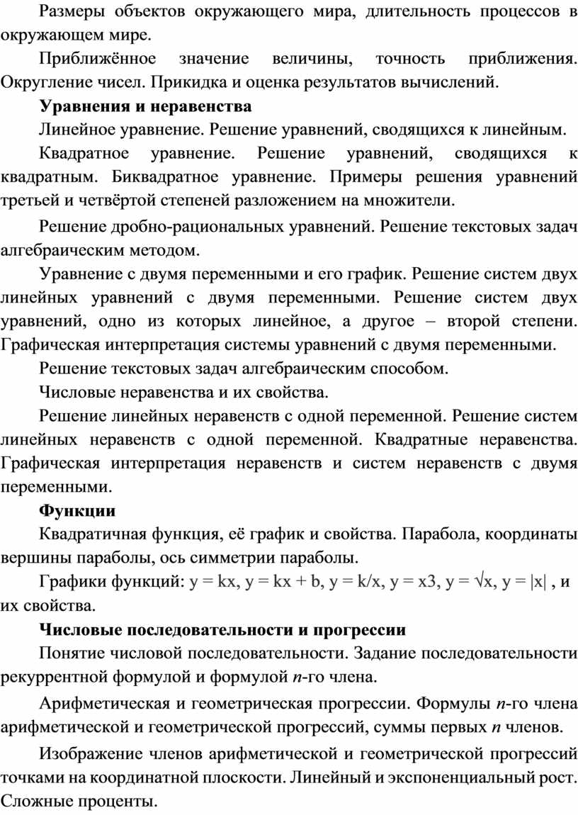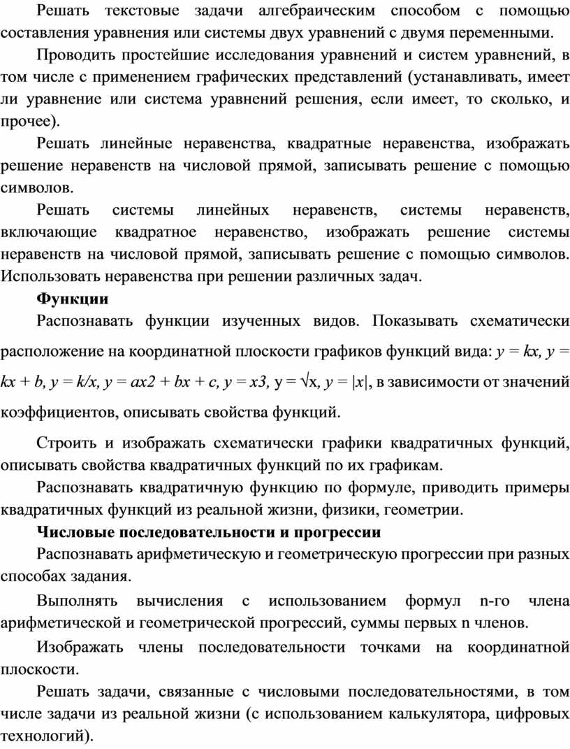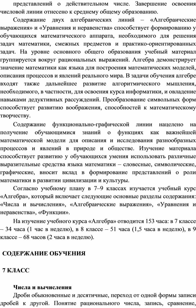 Содержание двух алгебраических линий – «Алгебраические выражения» и «Уравнения и неравенства» способствует формированию у обучающихся математического аппарата, необходимого для решения задач математики, смежных предметов и практико-ориентированных задач. На уровне основного общего образования учебный материал группируется вокруг рациональных выражений. Алгебра демонстрирует значение математики как языка для построения математических моделей, описания процессов и явлений реального мира. В задачи обучения алгебре входят также дальнейшее развитие алгоритмического мышления, необходимого, в частности, для освоения курса информатики, и овладение навыками дедуктивных рассуждений. Преобразование символьных форм способствует развитию воображения, способностей к математическому творчеству.