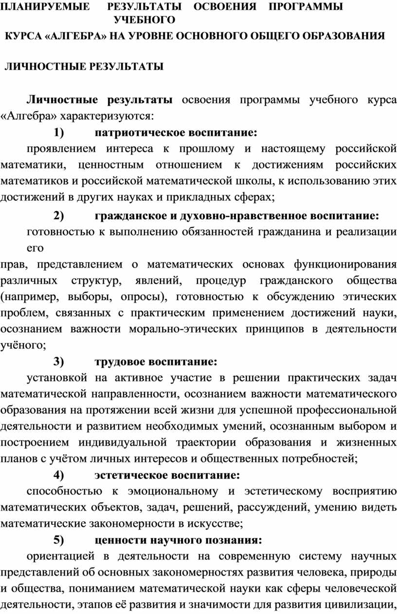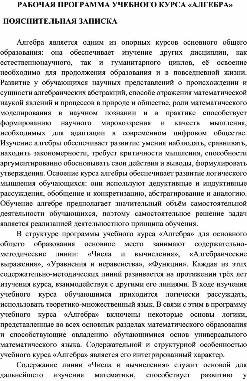 РАБОЧАЯ ПРОГРАММА УЧЕБНОГО КУРСА «АЛГЕБРА»