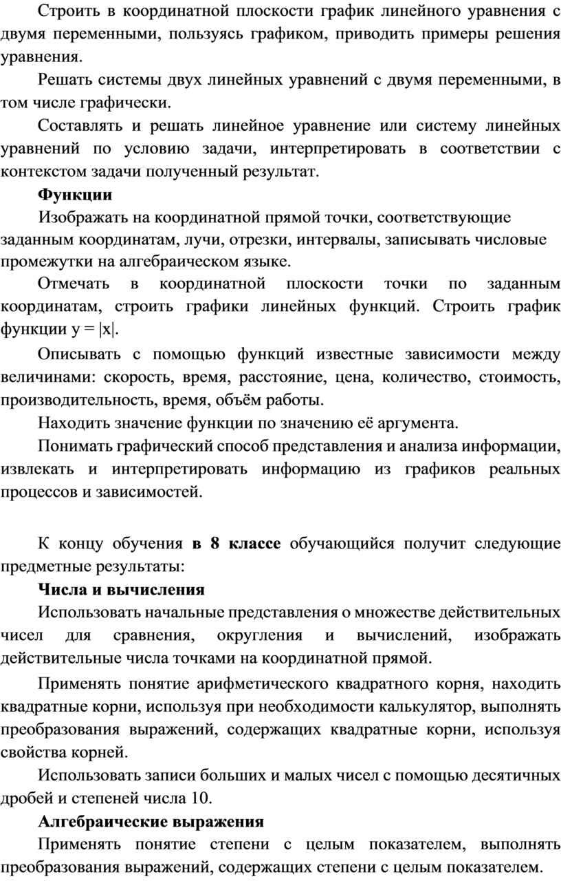 Содержание линии «Числа и вычисления» служит основой для дальнейшего изучения математики, способствует развитию у обучающихся логического мышления, формированию умения пользоваться алгоритмами, а также приобретению практических навыков, необходимых для повседневной жизни. Развитие понятия о числе на уровне основного общего образования связано с рациональными и иррациональными числами, формированием представлений о действительном числе. Завершение освоения числовой линии отнесено к среднему общему образованию.