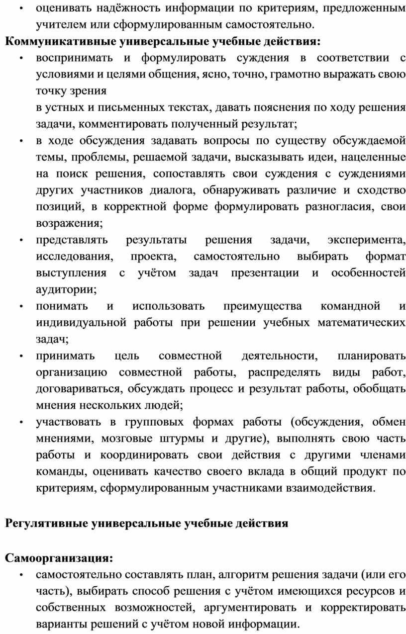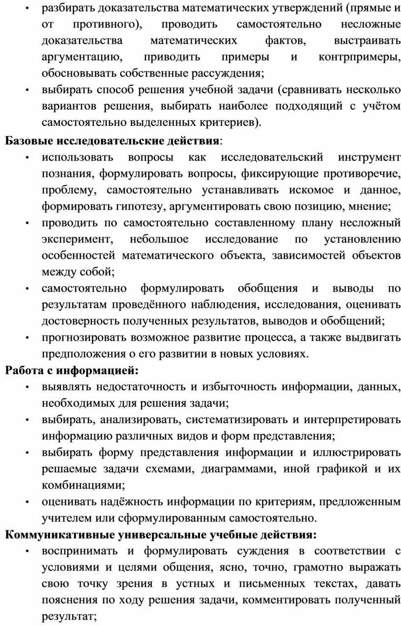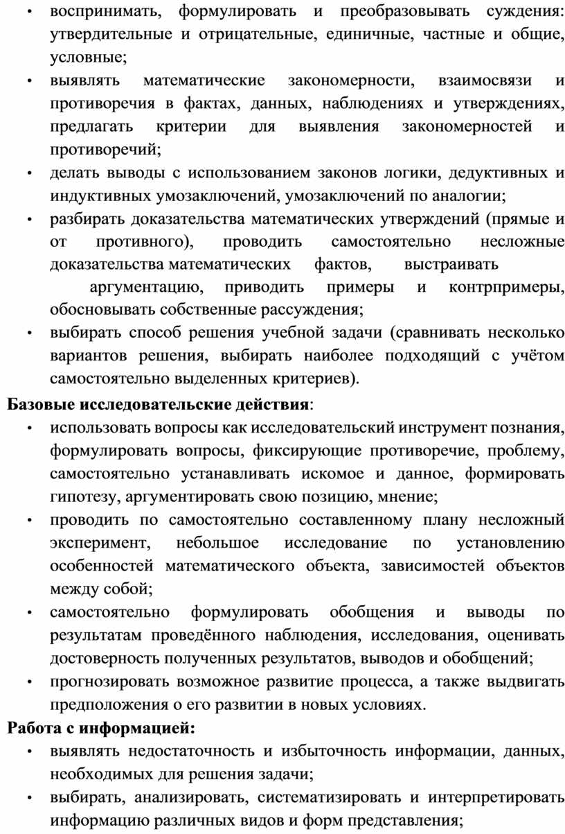 Изучение математики формирует у обучающихся математический стиль мышления, проявляющийся в определённых умственных навыках. Обучающиеся осваивают такие приёмы и методы мышления, как индукция и дедукция, обобщение и конкретизация, анализ и синтез, классификация и систематизация, абстрагирование и аналогия. Объекты математических умозаключений, правила их конструирования раскрывают механизм логических построений, способствуют выработке умения формулировать, обосновывать и доказывать суждения, тем самым развивают логическое мышление. Изучение математики обеспечивает формирование алгоритмической компоненты мышления и воспитание умений действовать по заданным алгоритмам, совершенствовать известные и конструировать новые. В процессе решения задач – основой учебной деятельности на уроках математики – развиваются творческая и прикладная стороны мышления. Обучение математике даёт возможность развивать у обучающихся точную, рациональную и информативную речь, умение отбирать наиболее подходящие языковые, символические, графические средства для выражения суждений и наглядного их представления.