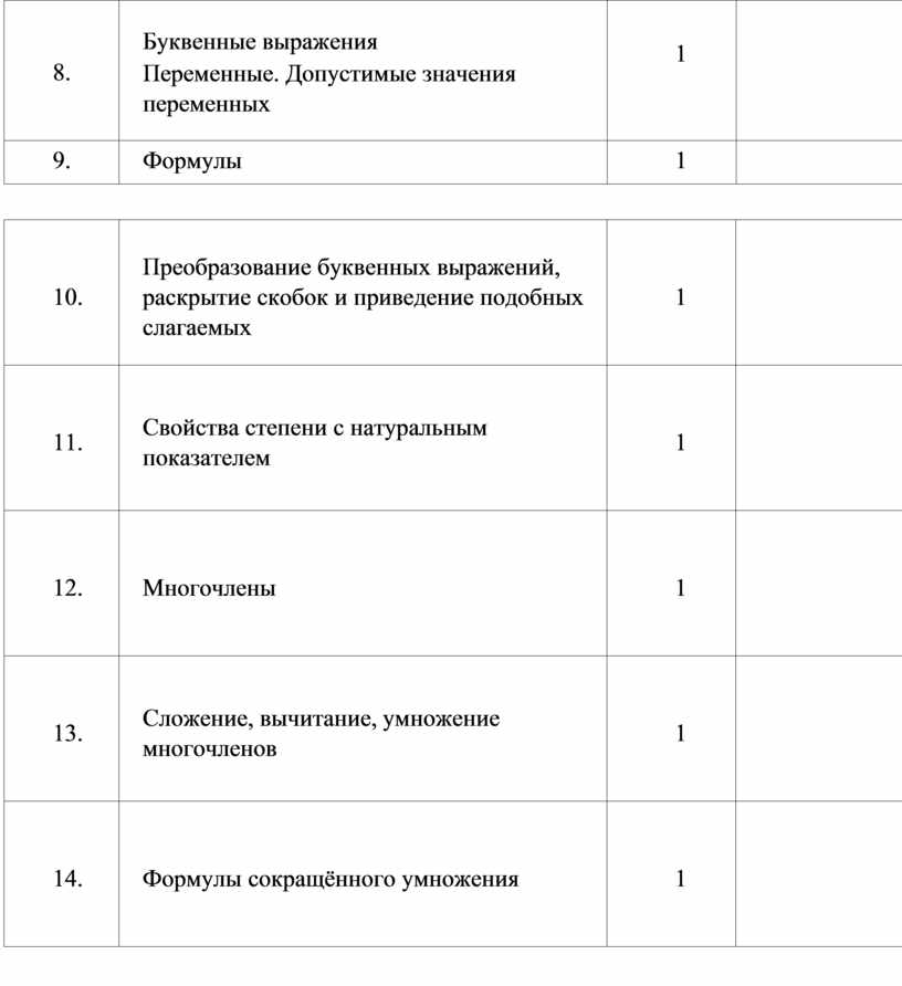 Переменные, числовое значение выражения с переменной. Допустимые значения переменных. Представление зависимости между величинами в виде формулы. Вычисления по формулам. Преобразование буквенных выражений, тождественно равные выражения, правила преобразования сумм и произведений, правила раскрытия скобок и приведения подобных слагаемых.