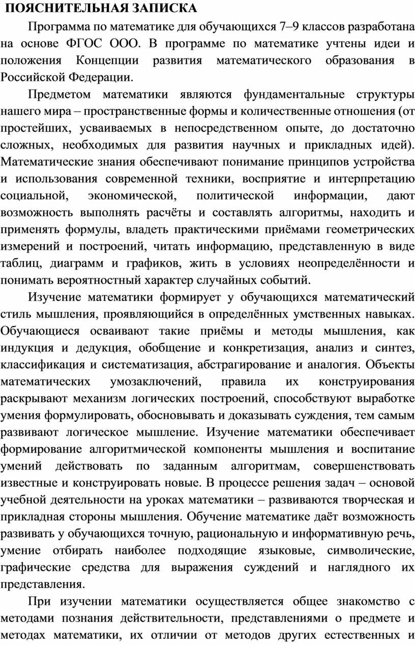 Программа по математике для обучающихся 7–9 классов разработана на основе ФГОС ООО. В программе по математике учтены идеи и положения Концепции развития математического образования в Российской Федерации.