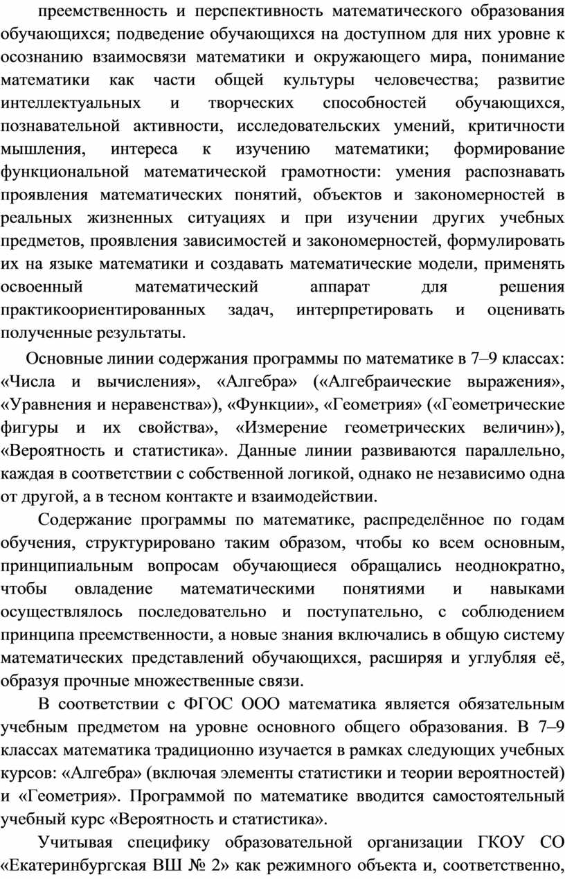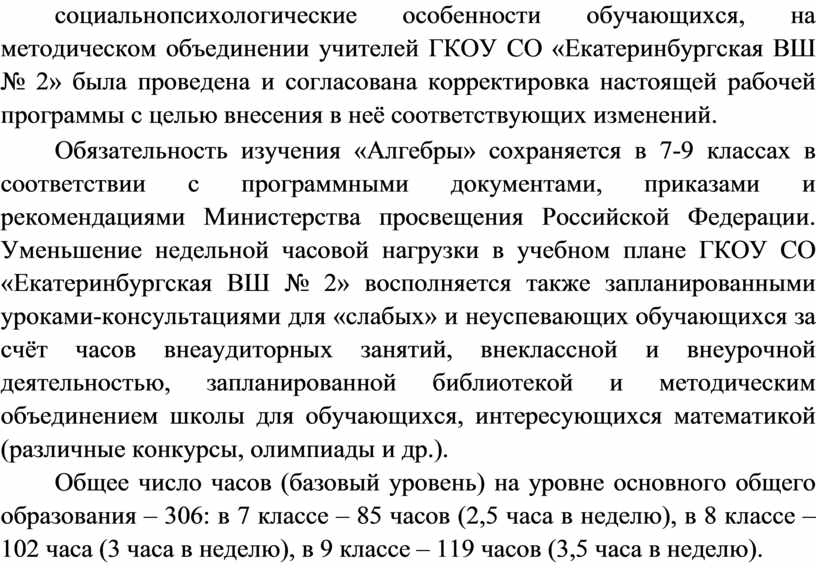 Обязательность изучения «Алгебры» сохраняется в 7-9 классах в соответствии с программными документами, приказами и рекомендациями Министерства просвещения Российской Федерации. Уменьшение недельной часовой нагрузки в учебном плане ГКОУ СО «Екатеринбургская ВШ № 2» восполняется также запланированными уроками-консультациями для «слабых» и неуспевающих обучающихся за счёт часов внеаудиторных занятий, внеклассной и внеурочной деятельностью, запланированной библиотекой и методическим объединением школы для обучающихся, интересующихся математикой (различные конкурсы, олимпиады и др.).