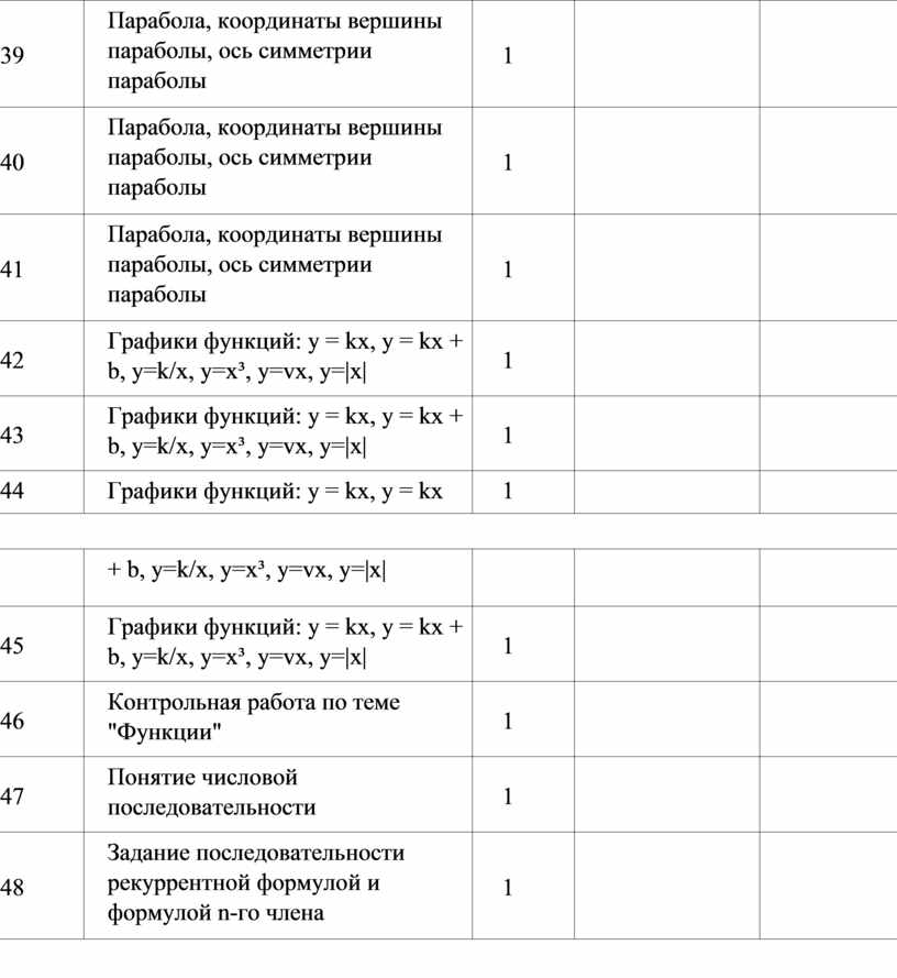 «Числа и вычисления», «Алгебра» («Алгебраические выражения», «Уравнения и неравенства»), «Функции», «Геометрия» («Геометрические фигуры и их свойства», «Измерение геометрических величин»), «Вероятность и статистика». Данные линии развиваются параллельно, каждая в соответствии с собственной логикой, однако не независимо одна от другой, а в тесном контакте и взаимодействии.
