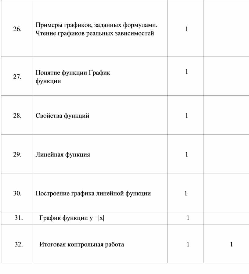 Прямоугольная система координат, оси Ox и Oy. Абсцисса и ордината точки на координатной плоскости. Примеры графиков, заданных формулами. Чтение графиков реальных зависимостей. Понятие функции. График функции. Свойства функций. Линейная функция, её график. График функции y = |x|. Графическое решение линейных уравнений и систем линейных уравнений.