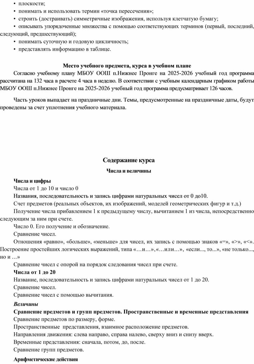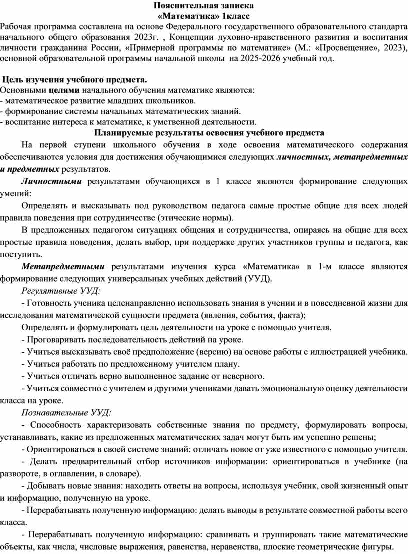 Рабочая программа составлена на основе Федерального государственного образовательного стандарта начального общего образования 2023г. , Концепции духовно-нравственного развития и воспитания личности гражданина России, «Примерной программы по математике» (М.: «Просвещение», 2023), основной образовательной программы начальной школы на 2025-2026 учебный год.