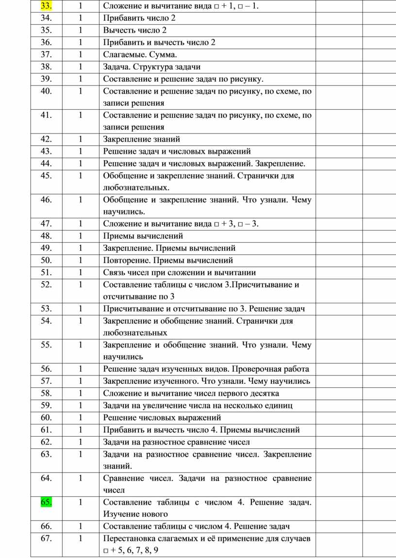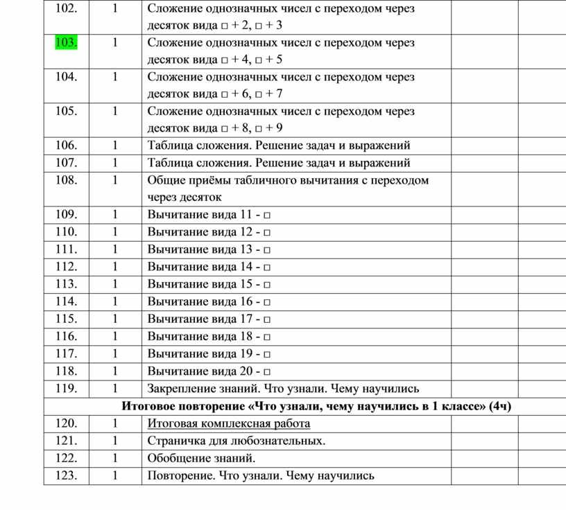 • выполнять сложение однозначных чисел с переходом через десяток и вычитание в пределах таблицы сложения, используя данную таблицу в качестве справочника;