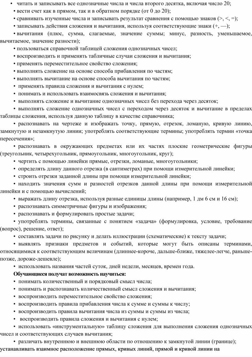 • читать и записывать все однозначные числа и числа второго десятка, включая число 20;