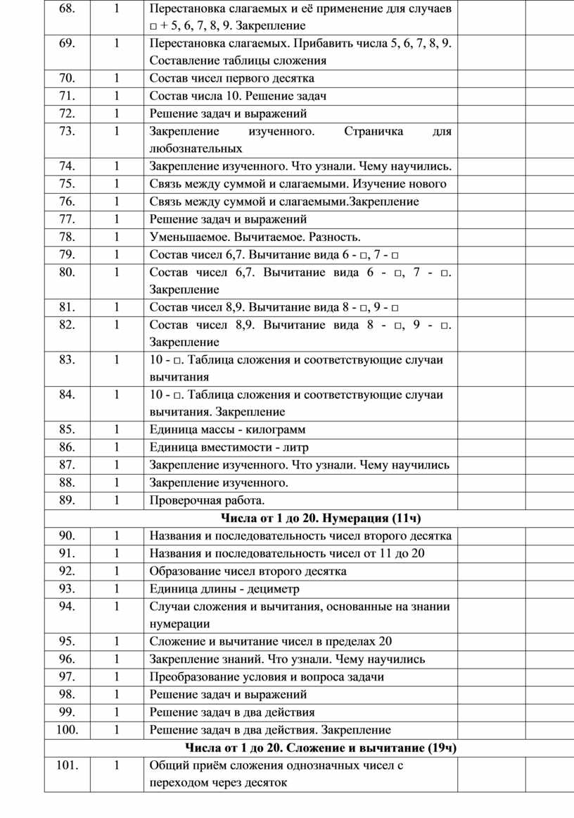 Числа от 1 до 20. Сложение и вычитание (19ч) |