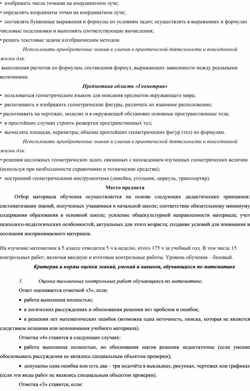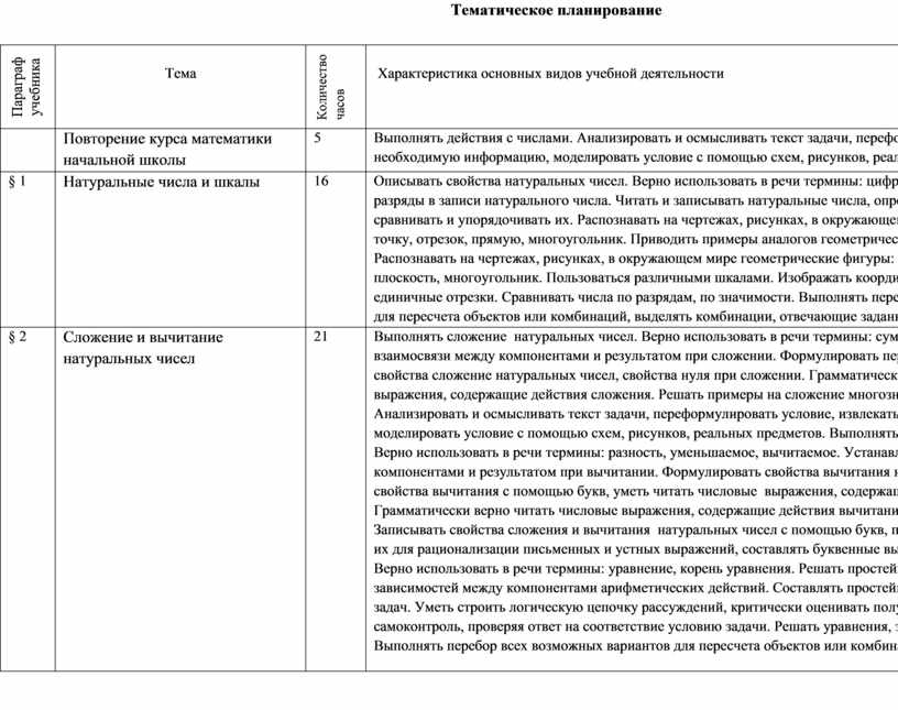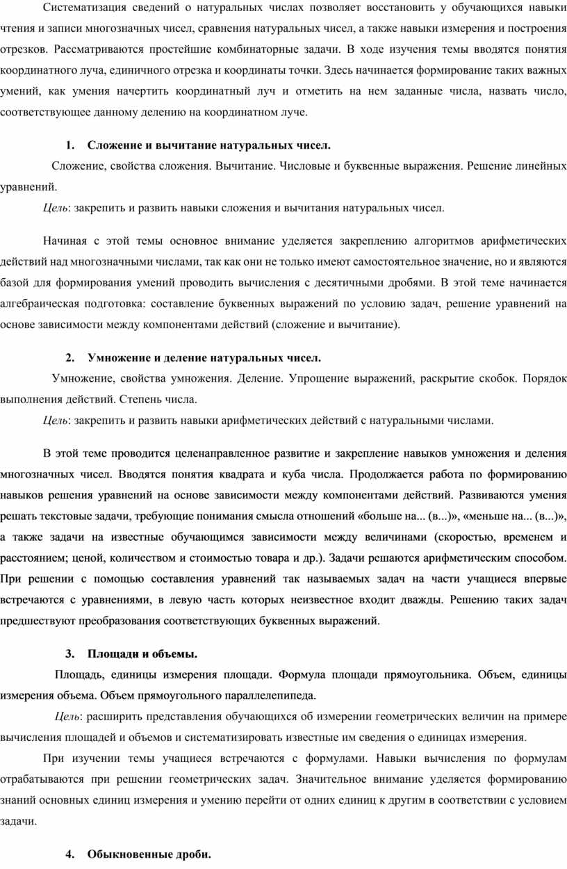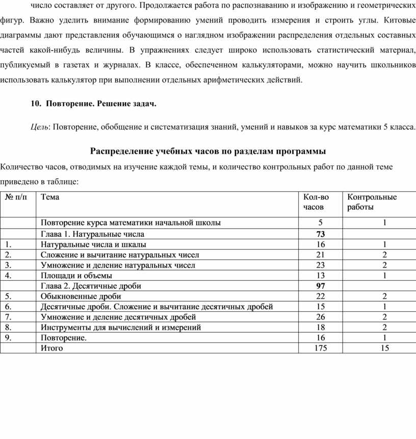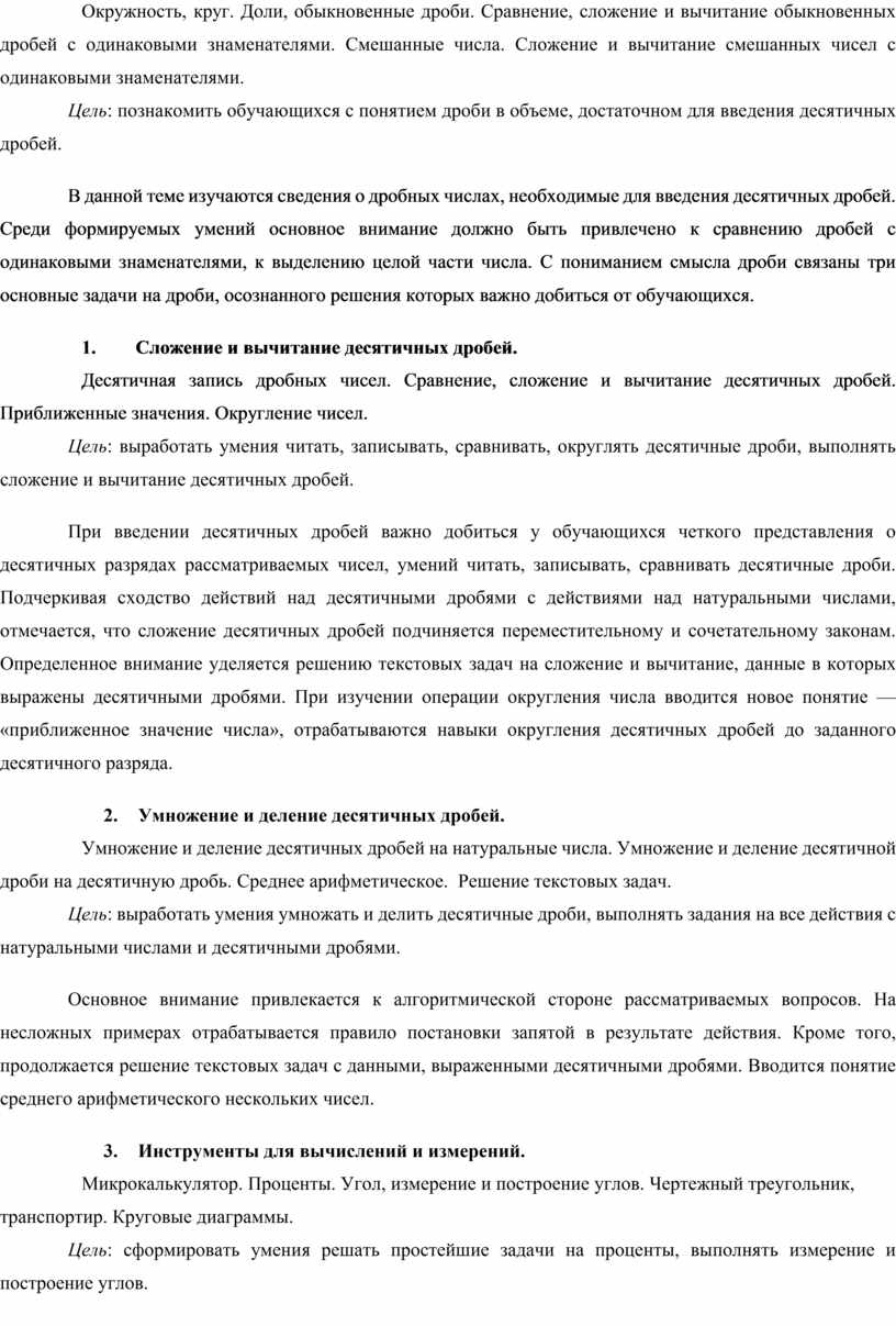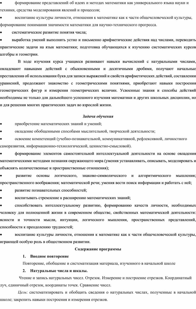 В ходе изучения курса учащиеся развивают навыки вычислений с натуральными числами, овладевают навыками действий с обыкновенными и десятичными дробями, получают начальные преставления об использовании букв для записи выражений и свойств арифметических действий, составлении уравнений, продолжают знакомство с геометрическими понятиями, приобретают навыки построения геометрических фигур и измерения геометрических величин. Усвоенные знания и способы действий необходимы не только для дальнейшего успешного изучения математики и других школьных дисциплин, но и для решения многих практических задач во взрослой жизни.