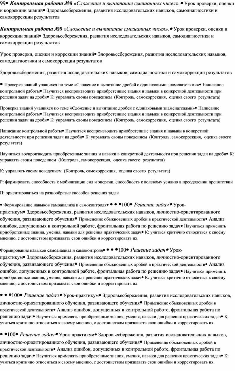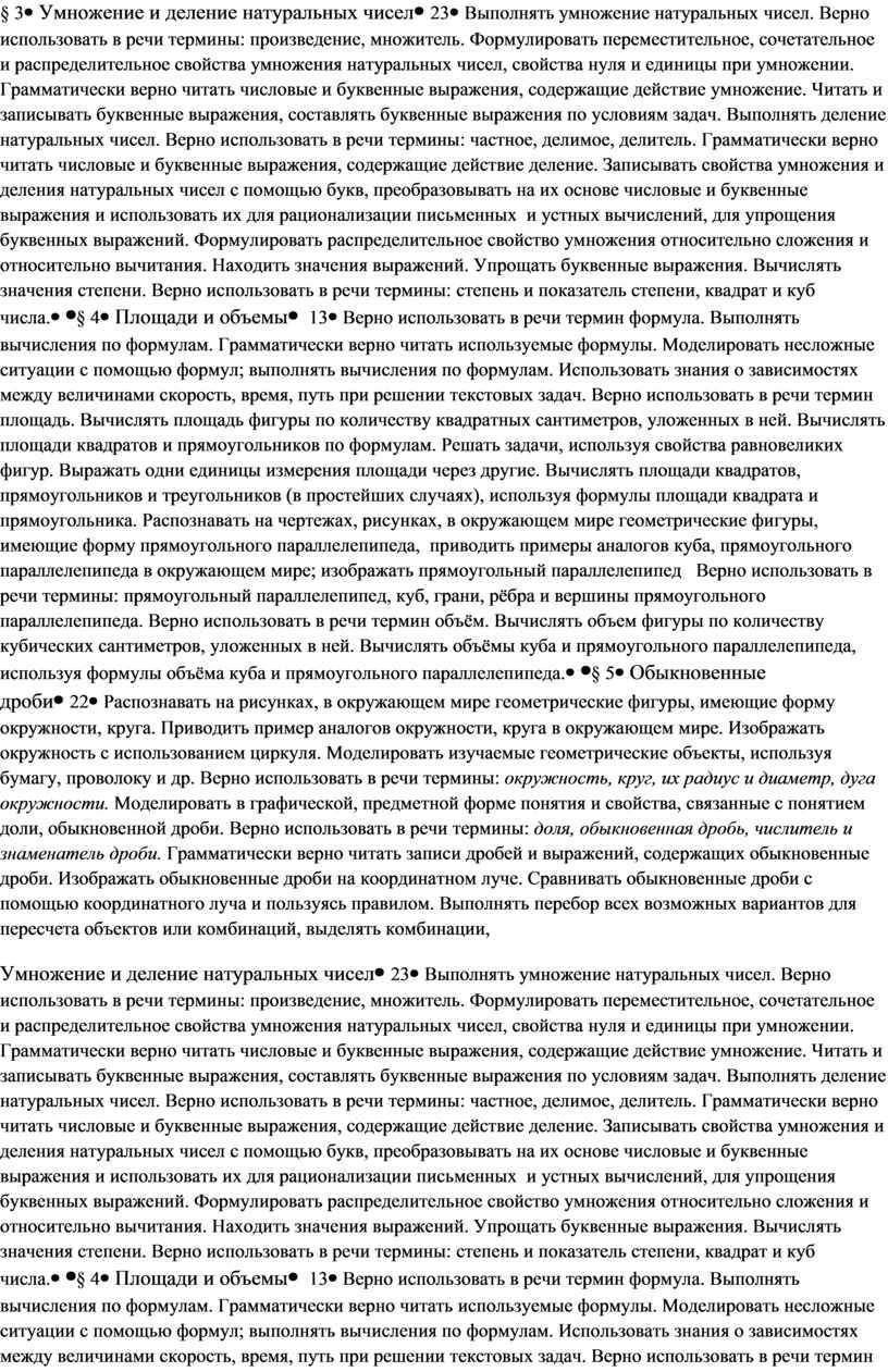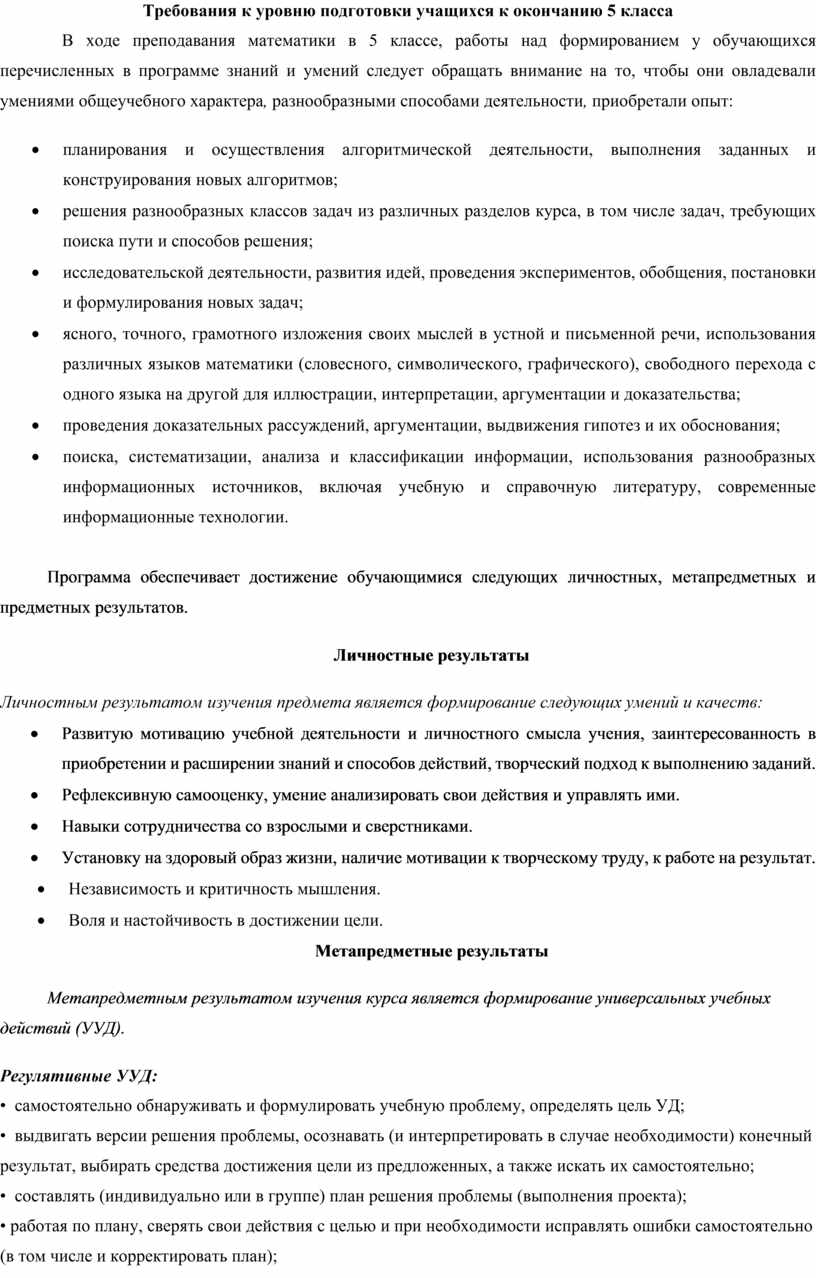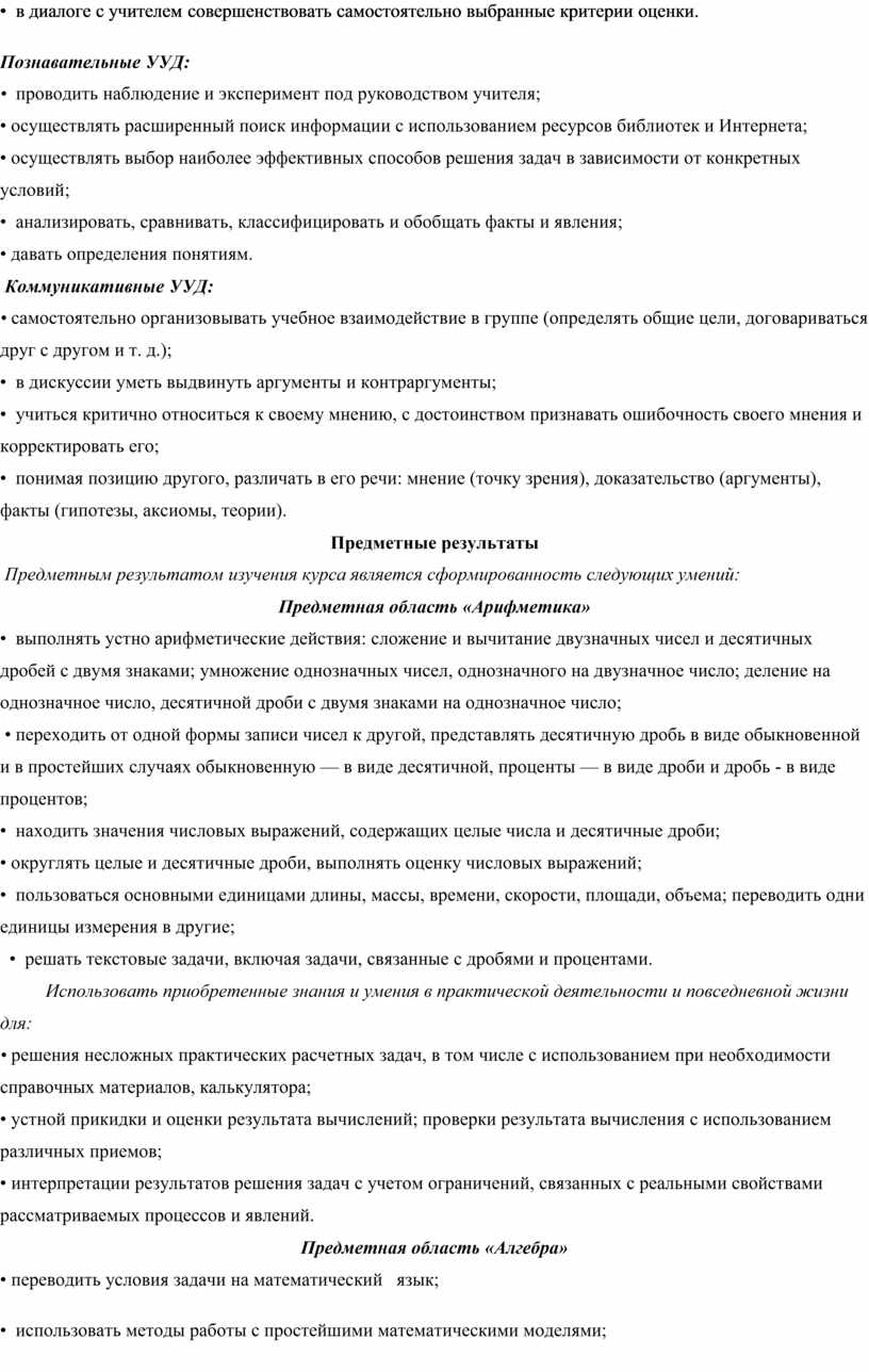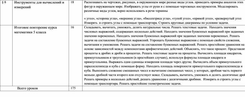 В ходе изучения курса учащиеся развивают навыки вычислений с натуральными числами, овладевают навыками действий с обыкновенными и десятичными дробями, получают начальные преставления об использовании букв для записи выражений и свойств арифметических действий, составлении уравнений, продолжают знакомство с геометрическими понятиями, приобретают навыки построения геометрических фигур и измерения геометрических величин. Усвоенные знания и способы действий необходимы не только для дальнейшего успешного изучения математики и других школьных дисциплин, но и для решения многих практических задач во взрослой жизни.