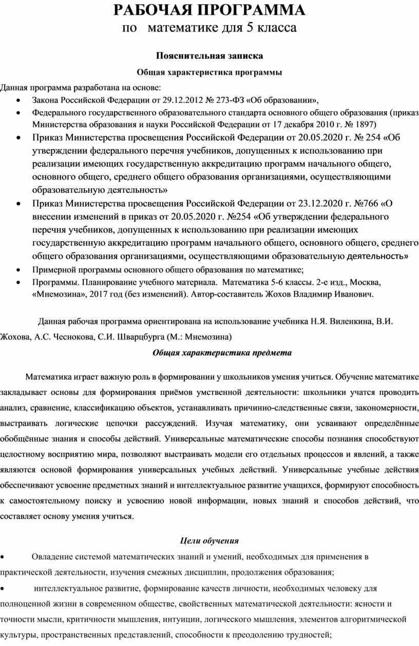 Данная рабочая программа ориентирована на использование учебника Н.Я. Виленкина, В.И. Жохова, А.С. Чеснокова, С.И. Шварцбурга (М.: Мнемозина)