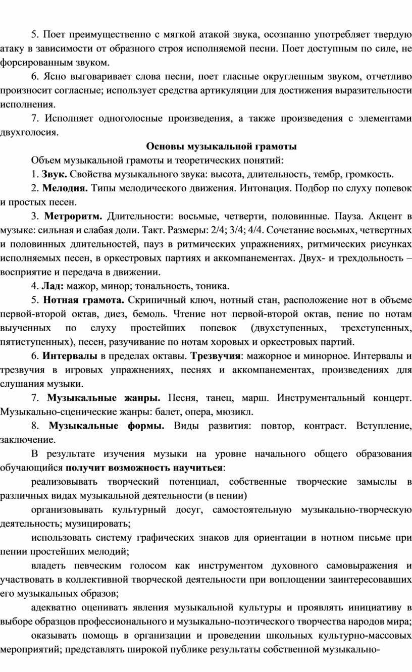 Объем музыкальной грамоты и теоретических понятий: