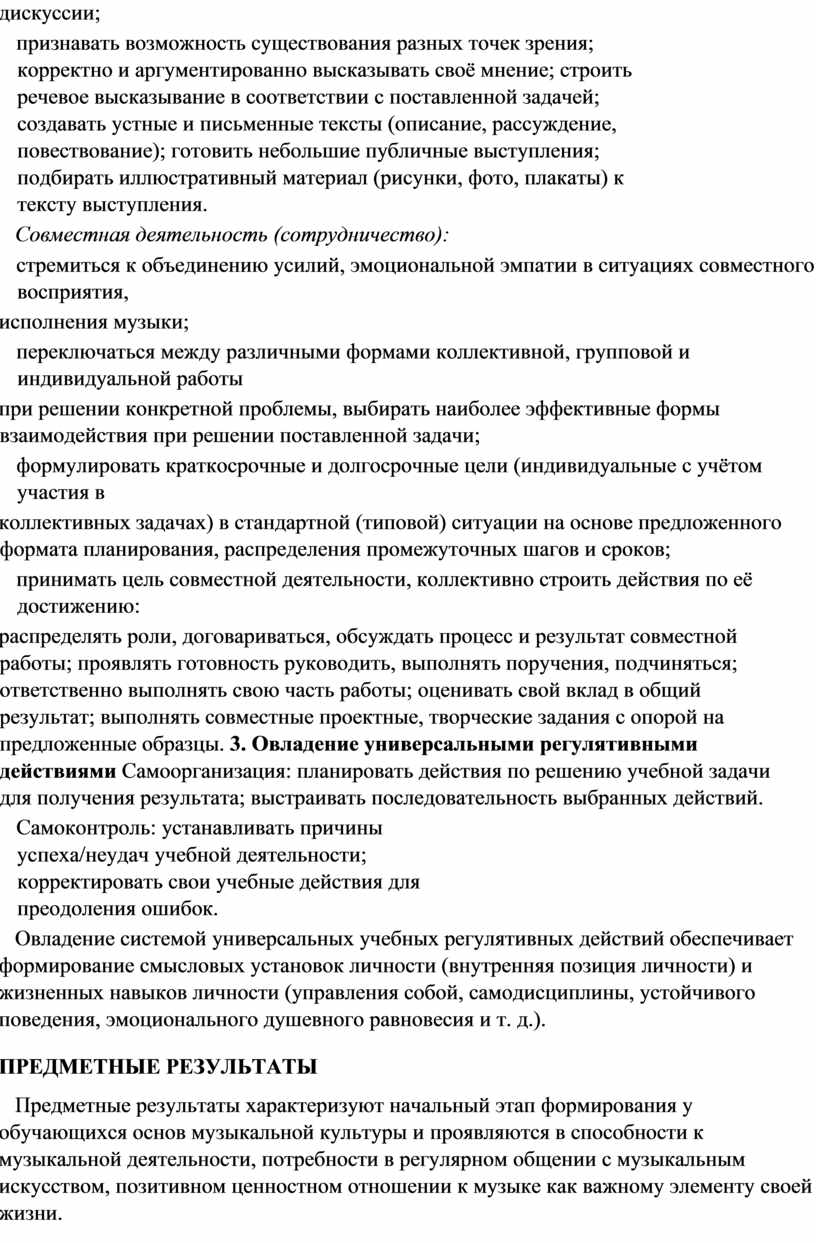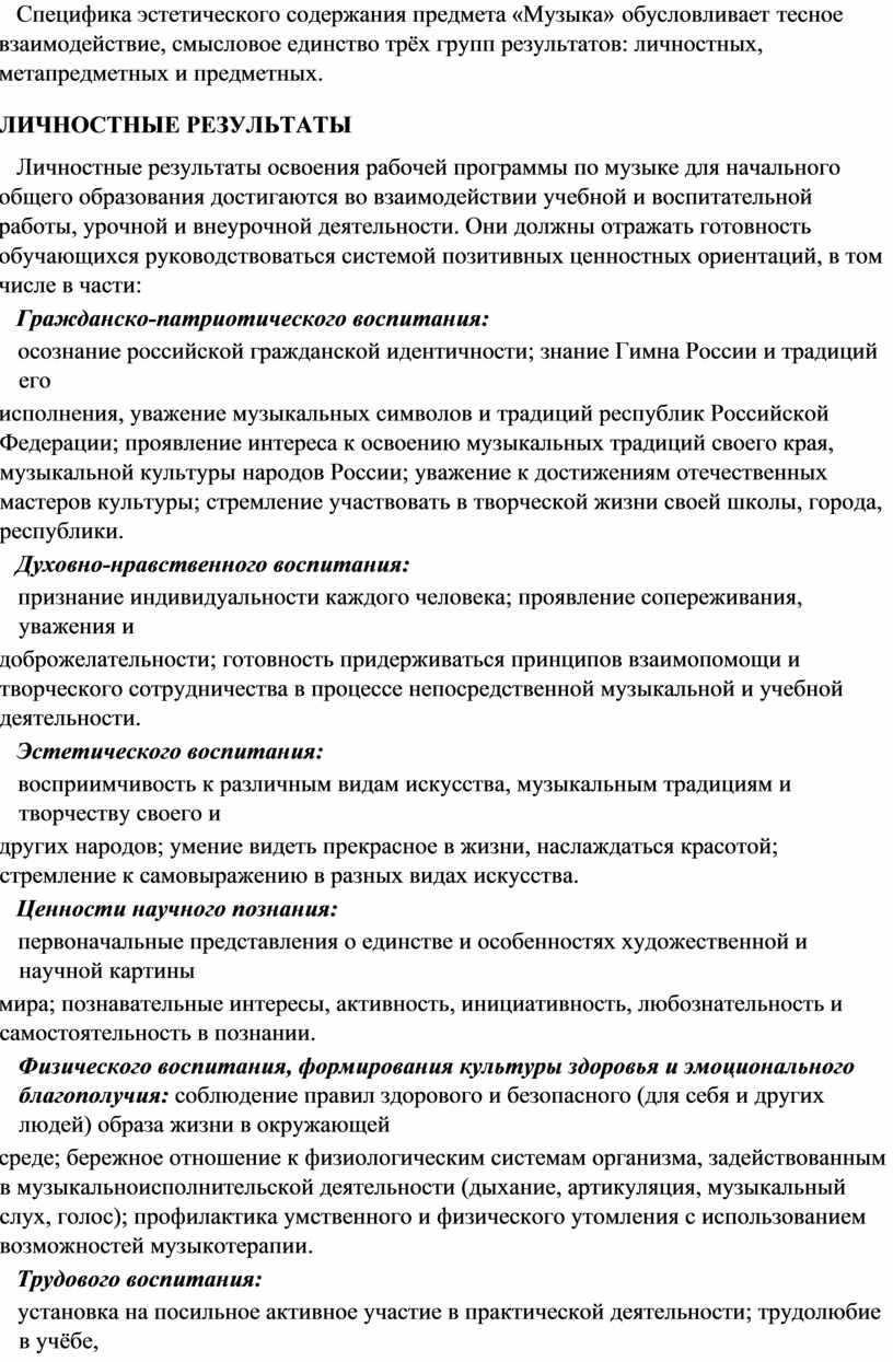 Специфика эстетического содержания предмета «Музыка» обусловливает тесное взаимодействие, смысловое единство трёх групп результатов: личностных, метапредметных и предметных.