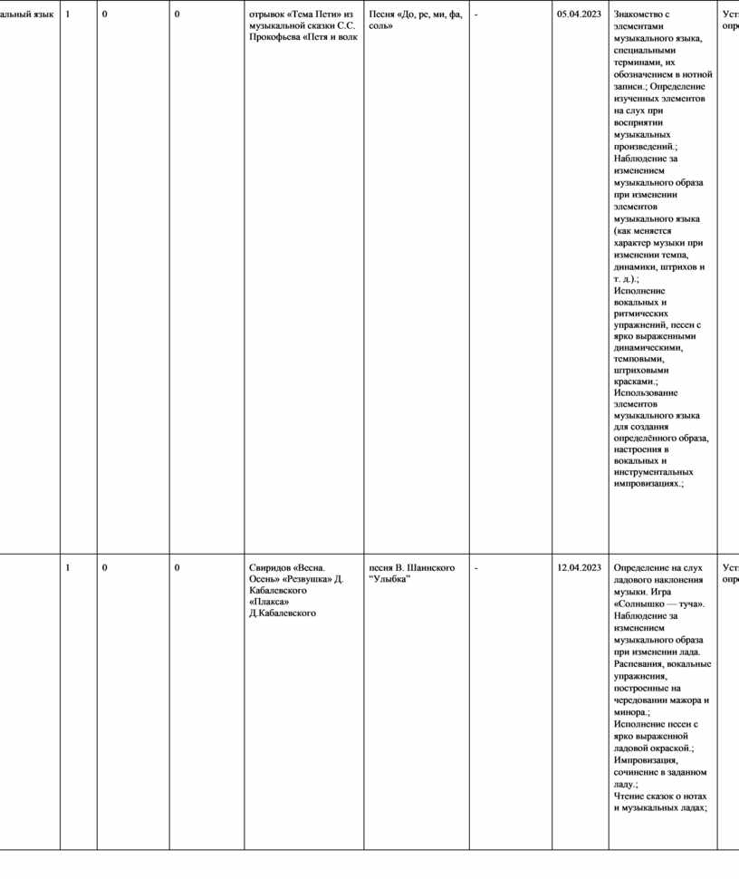 Знакомство с элементами музыкального языка, специальными терминами, их обозначением в нотной записи.; Определение изученных элементов на слух при восприятии музыкальных произведений.; Наблюдение за изменением музыкального образа при изменении элементов музыкального языка (как меняется характер музыки при изменении темпа, динамики, штрихов и т. д.).; Исполнение вокальных и ритмических упражнений, песен с ярко выраженными динамическими, темповыми, штриховыми красками.; Использование элементов музыкального языка для создания определённого образа, настроения в вокальных и инструментальных импровизациях.; |