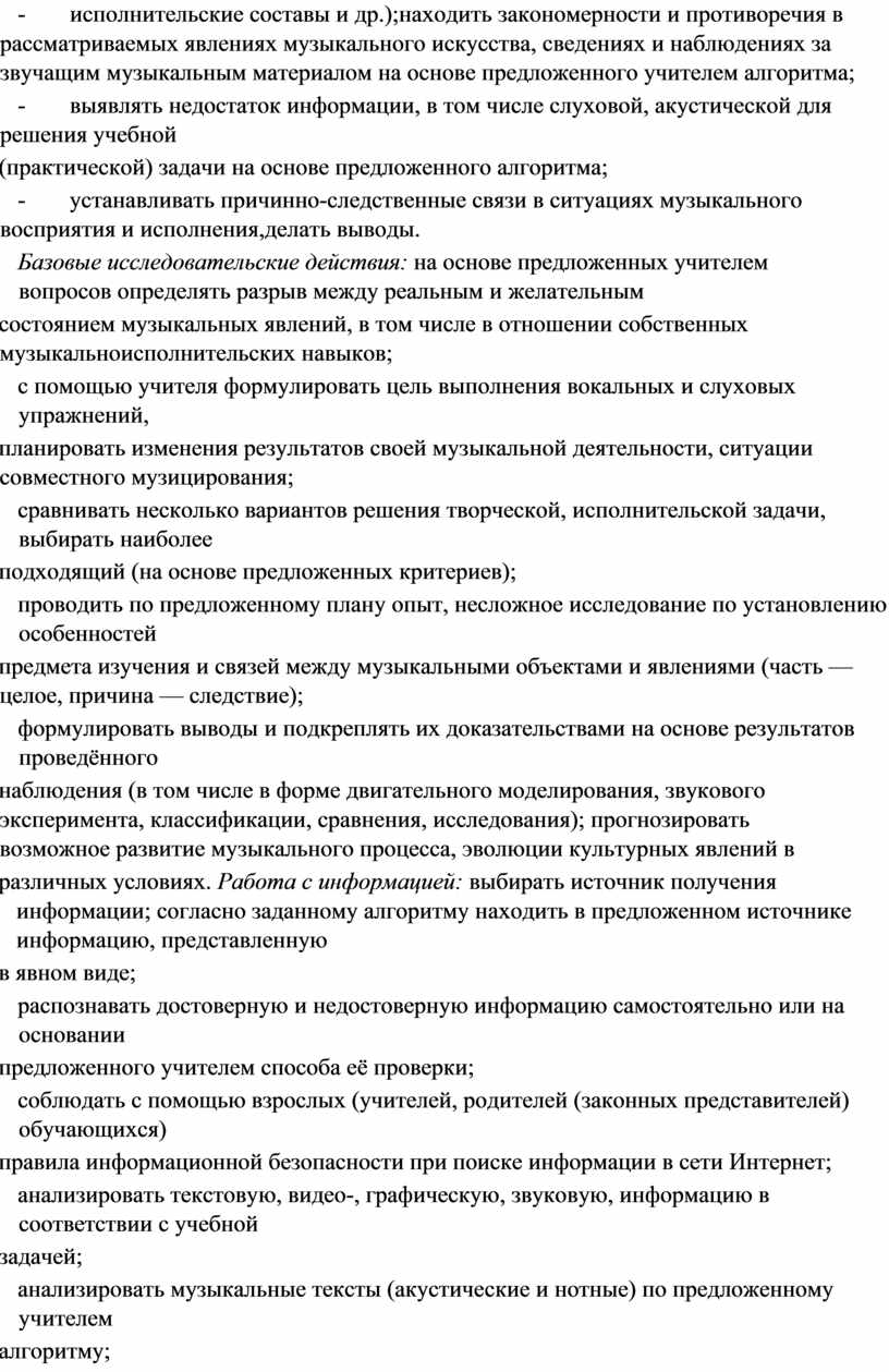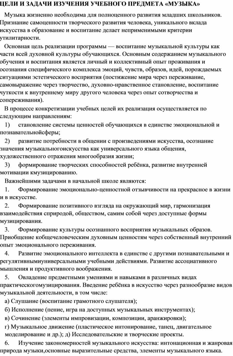 В течение периода начального общего музыкального образования необходимо заложить основы будущей музыкальной культуры личности, сформировать представления о многообразии проявлений музыкального искусства в жизни современного человека и общества. Поэтому в содержании образования должны быть представлены различные пласты музыкального искусства: фольклор, классическая, современная музыка, в том числе наиболее достойные образцы массовой музыкальной культуры (джаз, эстрада, музыка кино и др.). При этом наиболее эффективной формой освоения музыкального искусства является практическое музицирование — пение, игра на доступных музыкальных инструментах, различные формы музыкального движения. В ходе активной музыкальной деятельности происходит постепенное освоение элементов музыкального языка, понимание основных жанровых особенностей, принципов и форм развития музыки.