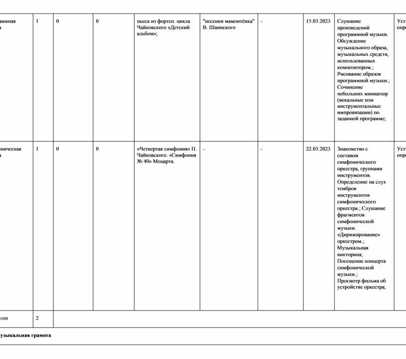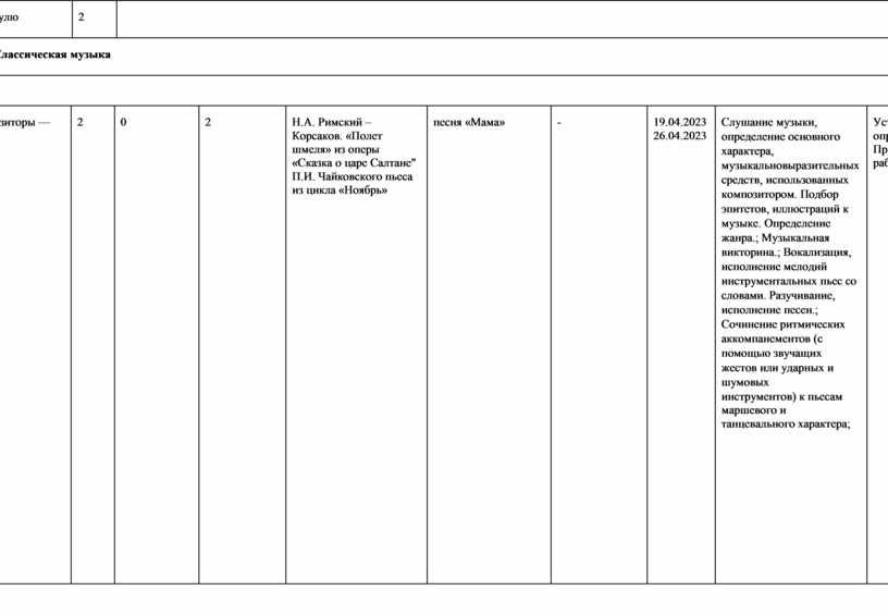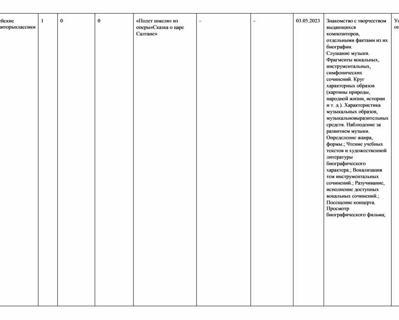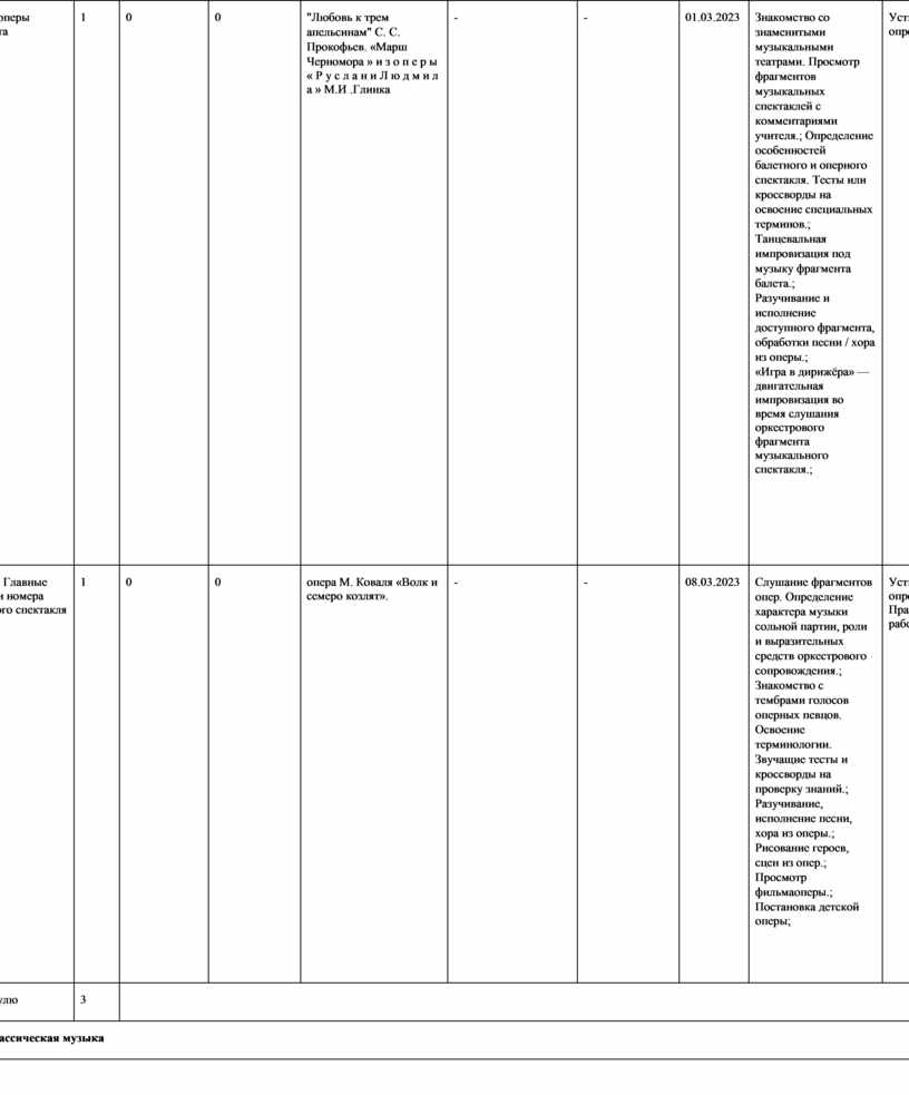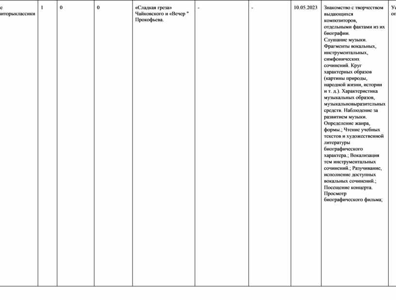 Знакомство с творчеством выдающихся композиторов, отдельными фактами из их биографии. Слушание музыки. Фрагменты вокальных, инструментальных, симфонических сочинений. Круг характерных образов (картины природы, народной жизни, истории и т. д.). Характеристика музыкальных образов, музыкальновыразительных средств. Наблюдение за развитием музыки. Определение жанра, формы.; Чтение учебных текстов и художественной литературы биографического характера.; Вокализация тем инструментальных сочинений.; Разучивание, исполнение доступных вокальных сочинений.; Посещение концерта. Просмотр биографического фильма; |