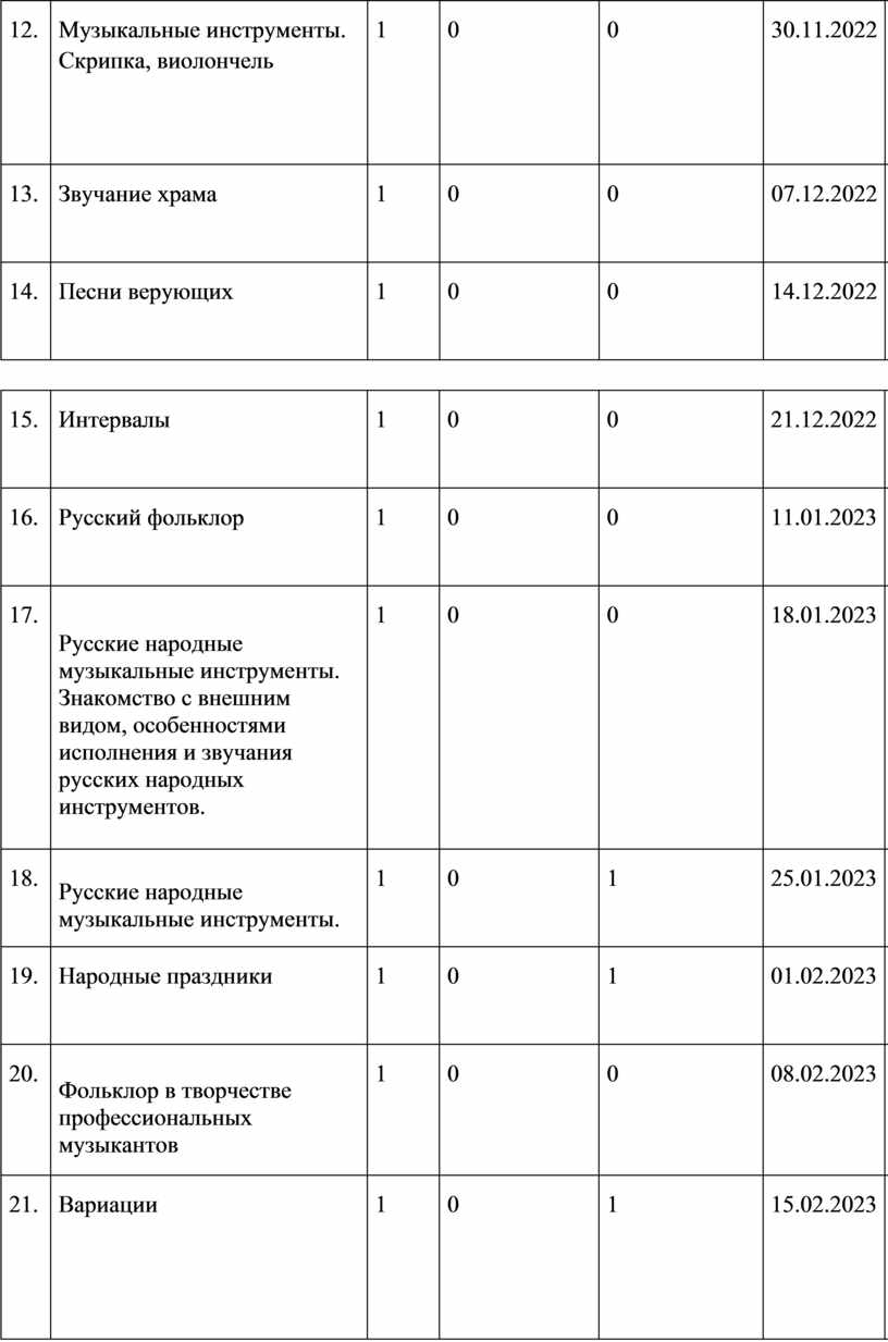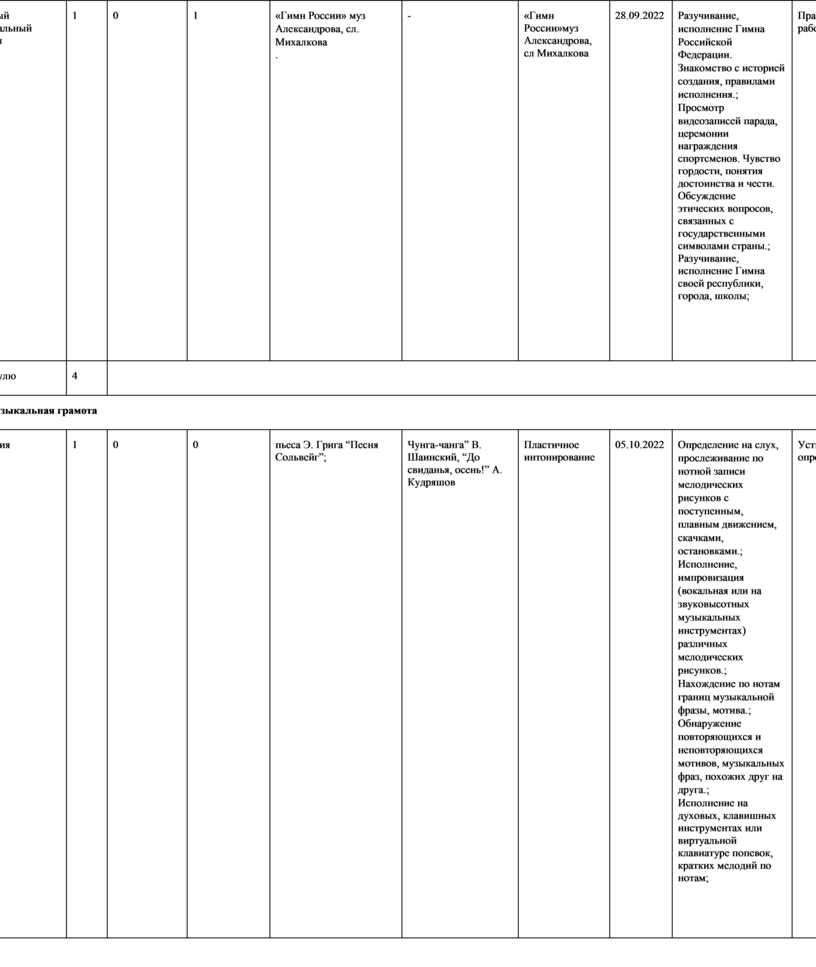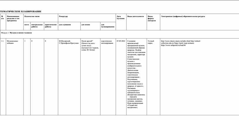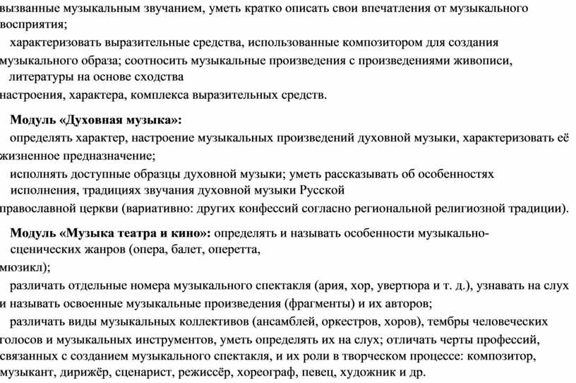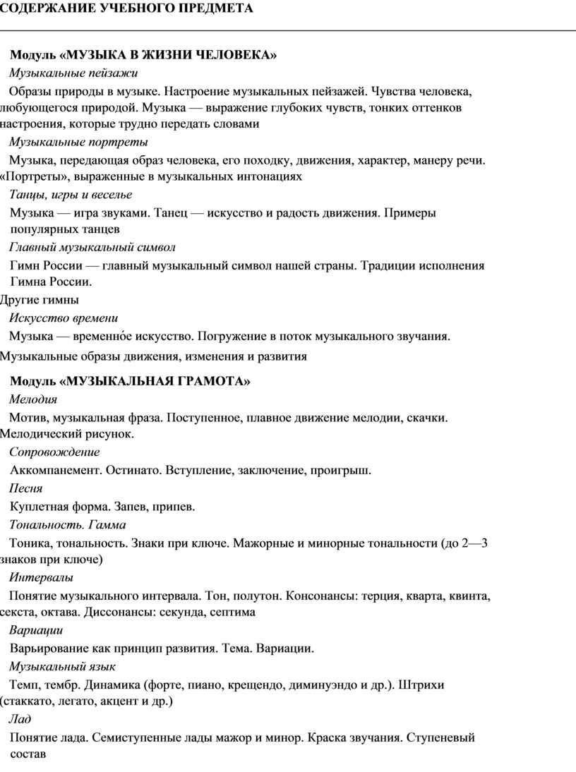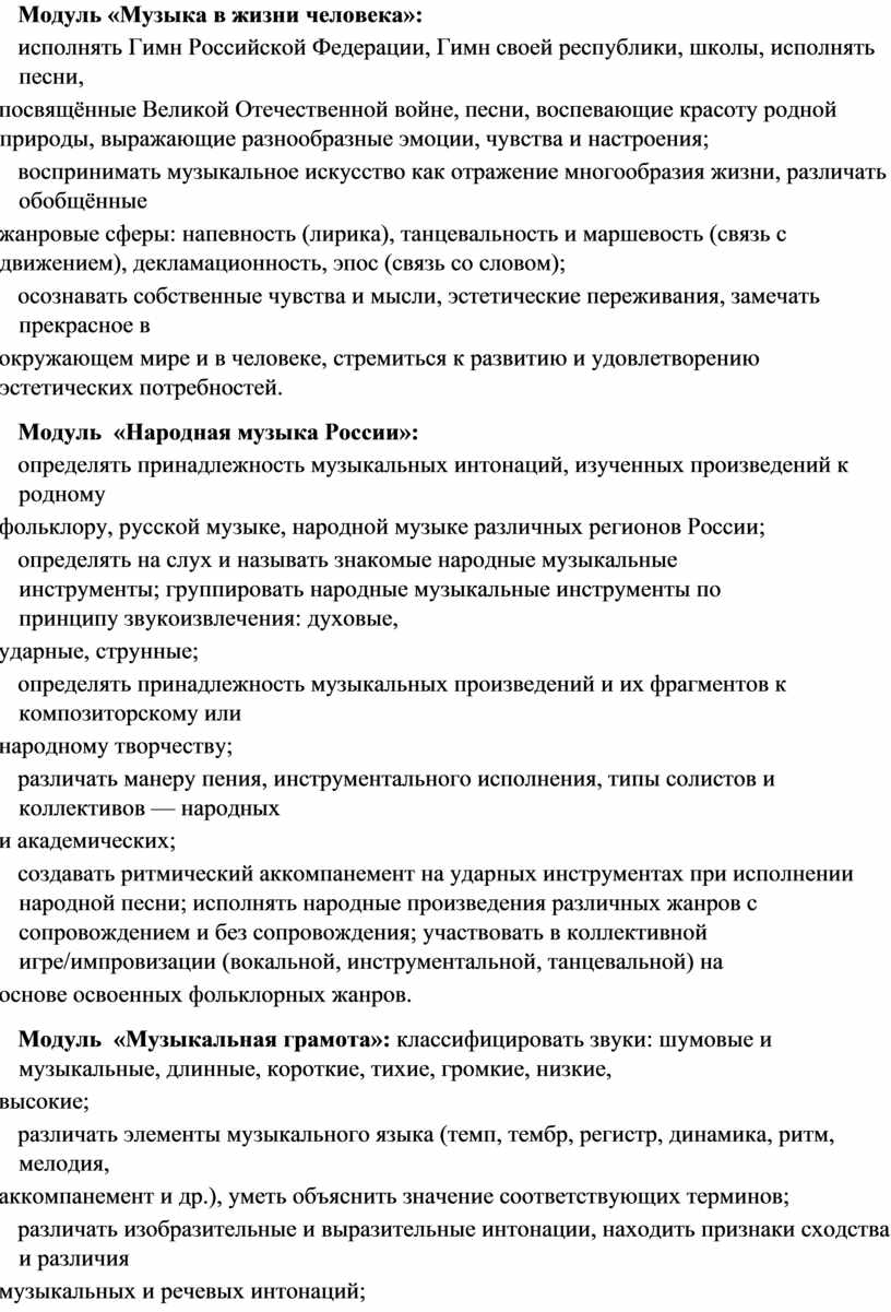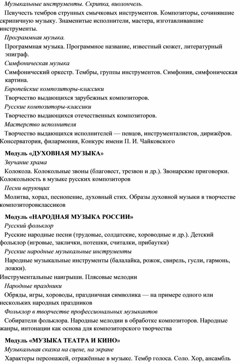 модуль № 1 «Музыкальная грамота»; модуль № 2 «Народная музыка России»; модуль № 3 «Музыка народов мира»; модуль № 4 «Духовная музыка»; модуль № 5 «Классическая музыка»; модуль № 6 «Современная музыкальная культура»; модуль № 7 «Музыка театра и кино»; модуль № 8 «Музыка в жизни человека».