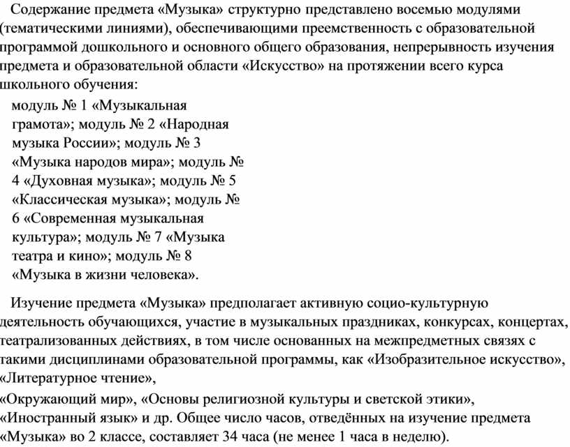 Изучение предмета «Музыка» предполагает активную социо-культурную деятельность обучающихся, участие в музыкальных праздниках, конкурсах, концертах, театрализованных действиях, в том числе основанных на межпредметных связях с такими дисциплинами образовательной программы, как «Изобразительное искусство», «Литературное чтение»,