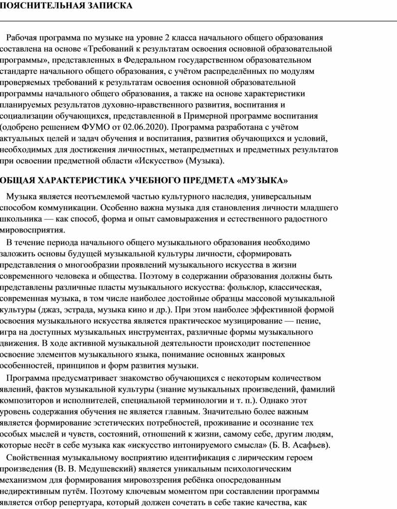 Рабочая программа по музыке на уровне 2 класса начального общего образования составлена на основе «Требований к результатам освоения основной образовательной программы», представленных в Федеральном государственном образовательном стандарте начального общего образования, с учётом распределённых по модулям проверяемых требований к результатам освоения основной образовательной программы начального общего образования, а также на основе характеристики планируемых результатов духовно-нравственного развития, воспитания и социализации обучающихся, представленной в Примерной программе воспитания (одобрено решением ФУМО от 02.06.2020). Программа разработана с учётом актуальных целей и задач обучения и воспитания, развития обучающихся и условий, необходимых для достижения личностных, метапредметных и предметных результатов при освоении предметной области «Искусство» (Музыка).