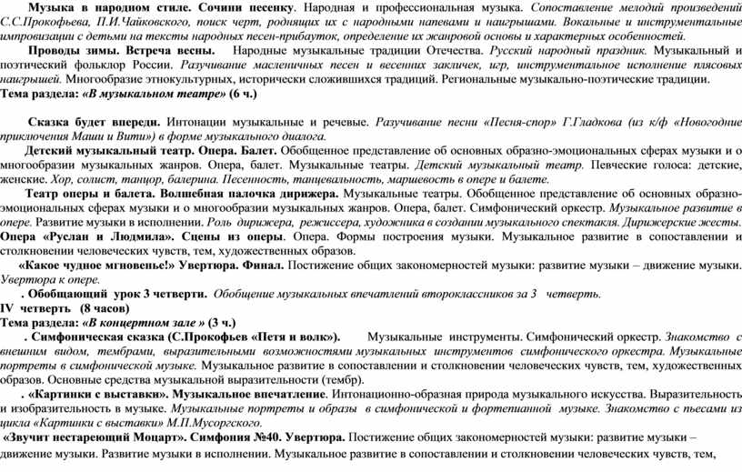 Музыка в народном стиле. Сочини песенку. Народная и профессиональная музыка. Сопоставление мелодий произведений С.С.Прокофьева, П.И.Чайковского, поиск черт, роднящих их с народными напевами и наигрышами. Вокальные и инструментальные импровизации с детьми на тексты народных песен-прибауток, определение их жанровой основы и характерных особенностей.