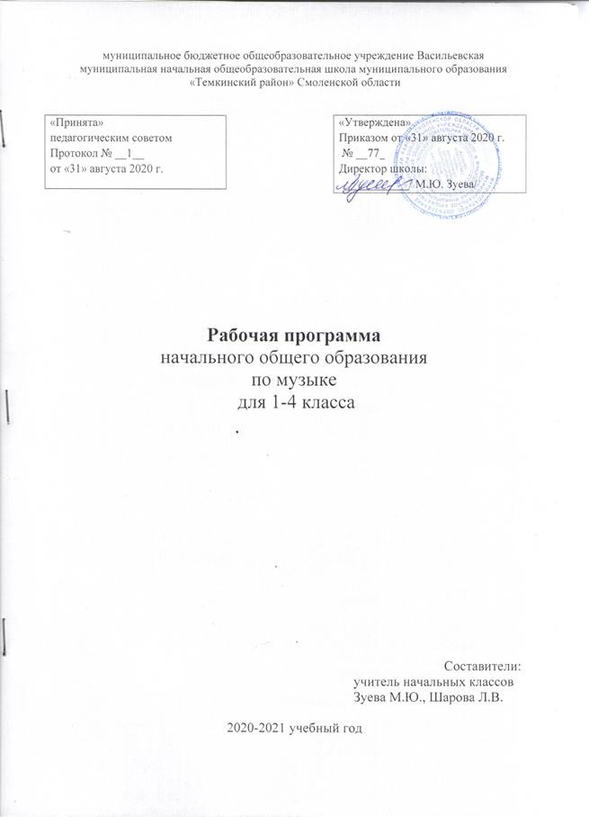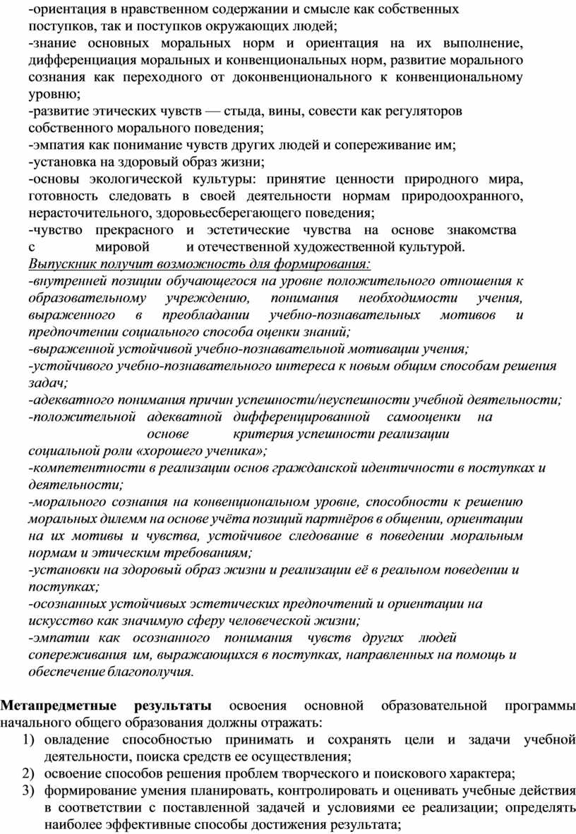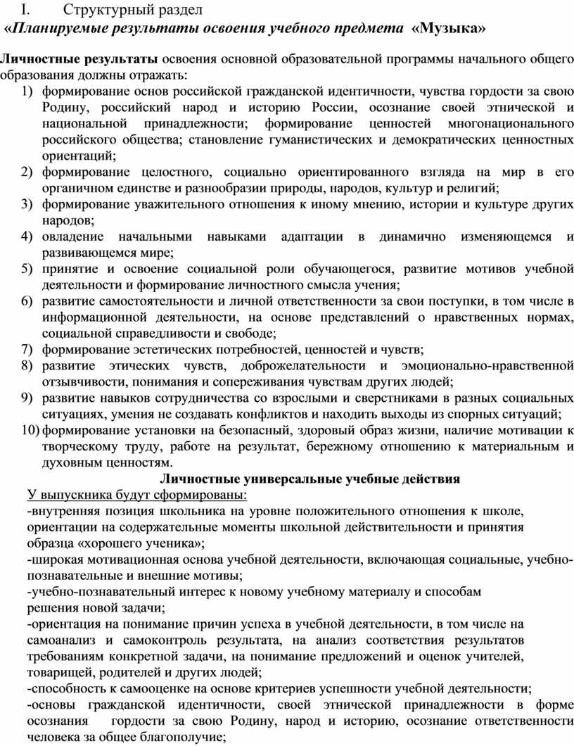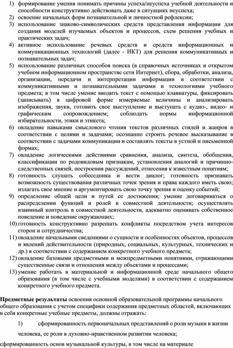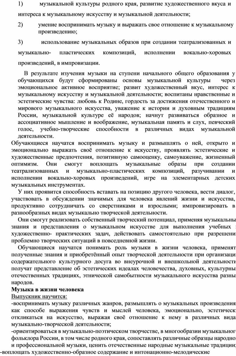 В результате изучения музыки на ступени начального общего образования у обучающихся будут сформированы основы музыкальной культуры через эмоциональное активное восприятие; развит художественный вкус, интерес к музыкальному искусству и музыкальной деятельности; воспитаны нравственные и эстетические чувства: любовь к Родине, гордость за достижения отечественного и мирового музыкального искусства, уважение к истории и духовным традициям России, музыкальной культуре её народов; начнут развиваться образное и ассоциативное мышление и воображение, музыкальная память и слух, певческий голос, учебно-творческие способности в различных видах музыкальной деятельности.