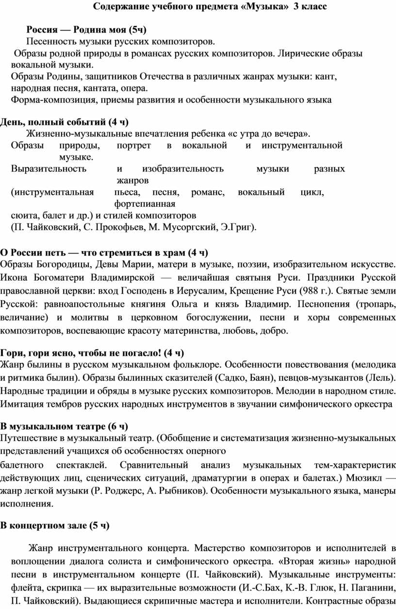 Музыка в жизни ребенка. Образы родного края. Роль поэта, художника, композитора в изображении картин природы (слова- краски-звуки). Образы утренней и вечерней природы в музыке. Музыкальные портреты. Разыгрывание музыкальной сказки. Образы защитников Отечества в музыке. Мамин праздник и музыкальные произведения. Своеобразие музыкального произведения в выражении чувств человека и окружающего его мира.