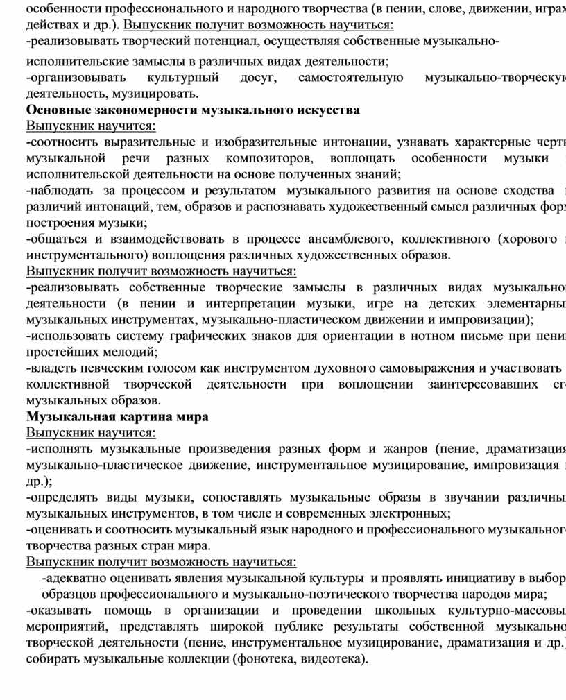 4) использование музыкальных образов при создании театрализованных и музыкально- пластических композиций, исполнении вокально-хоровых произведений, в импровизации.