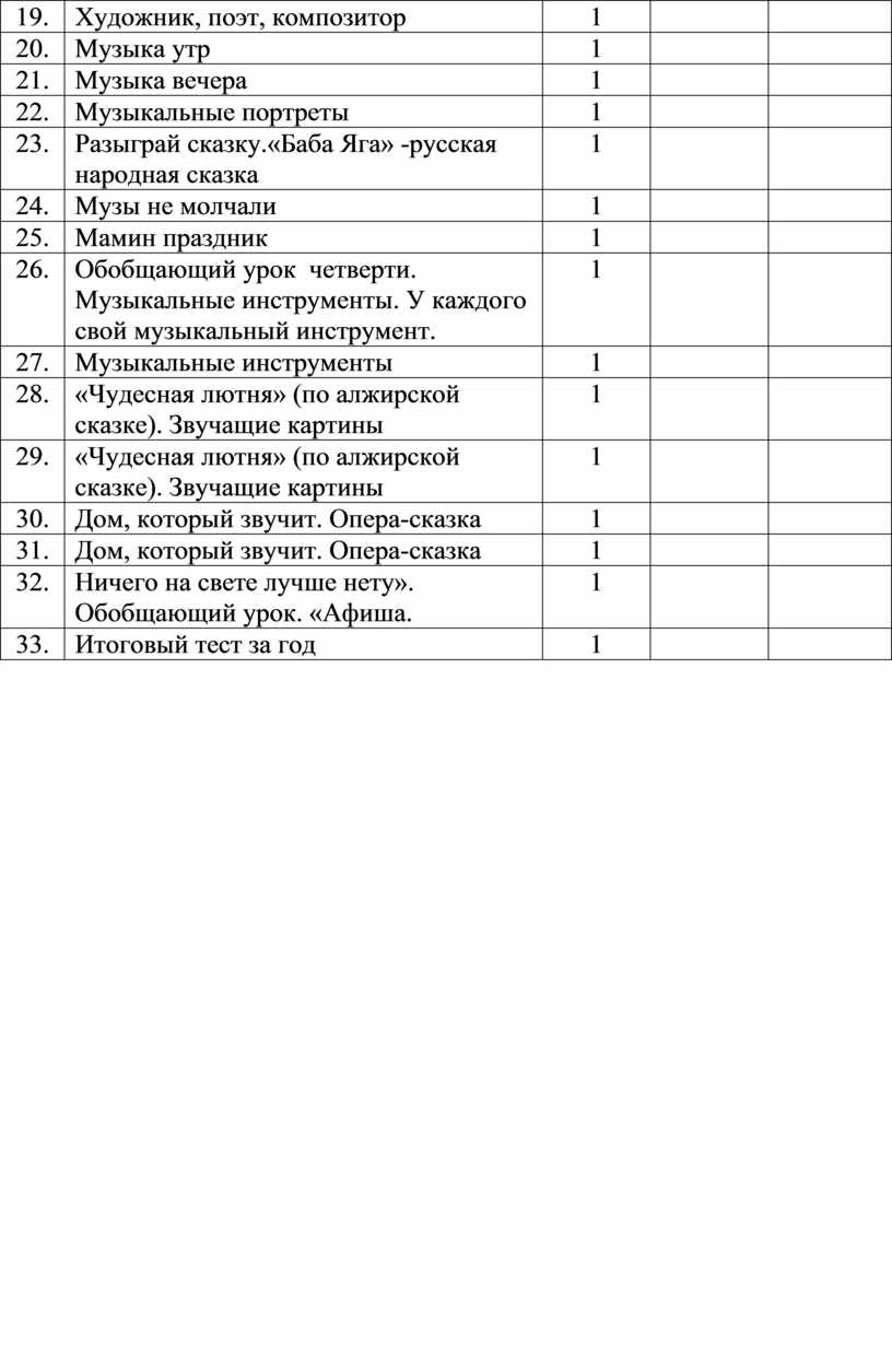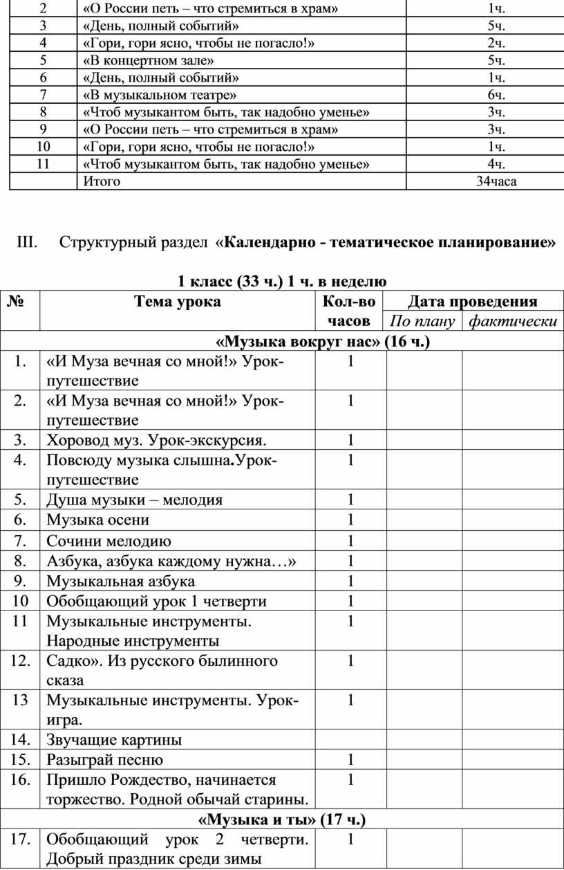 Музыка и ее роль в повседневной жизни человека. Композитор – исполнитель – слушатель. Песни, танцы и марши — основа многообразных жизненно-музыкальных впечатлений детей. Музы водят хоровод. Мелодия – душа музыки. Образы осенней природы в музыке. Словарь эмоций. Музыкальная азбука. Музыкальные инструменты: свирель, дудочка, рожок, гусли, флейта, арфа. Звучащие картины. Русский былинный сказ о гусляре Садко. Музыка в праздновании Рождества Христова. Музыкальный театр: балет.Первые опыты вокальных, ритмических и пластических импровизаций. Выразительное исполнение сочинений разных жанров и стилей. Выполнение творческих заданий, представленных в рабочих тетрадях.