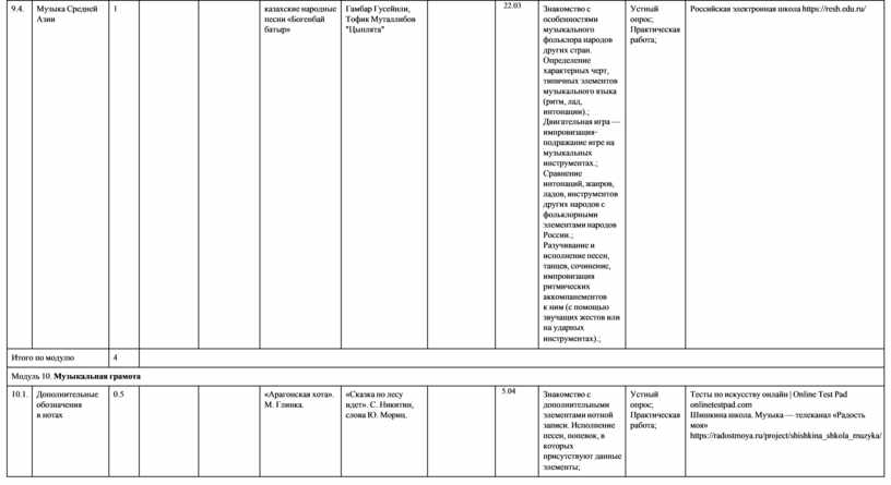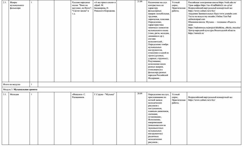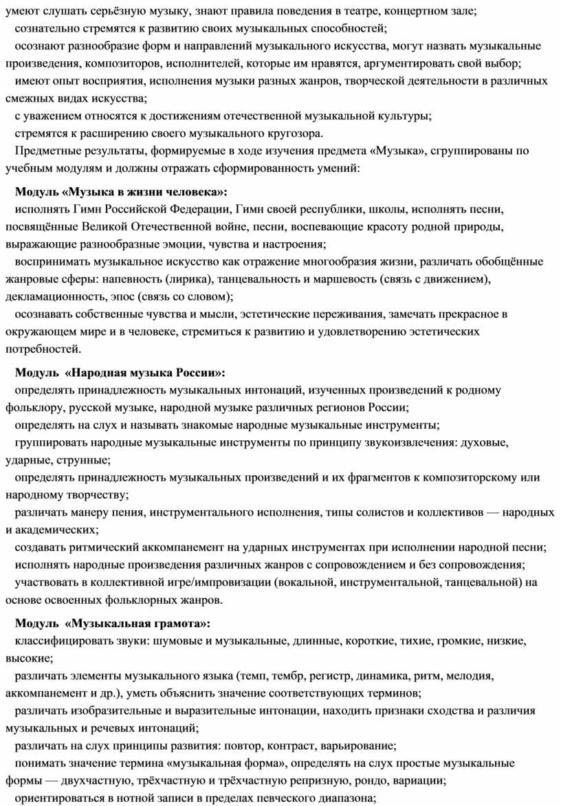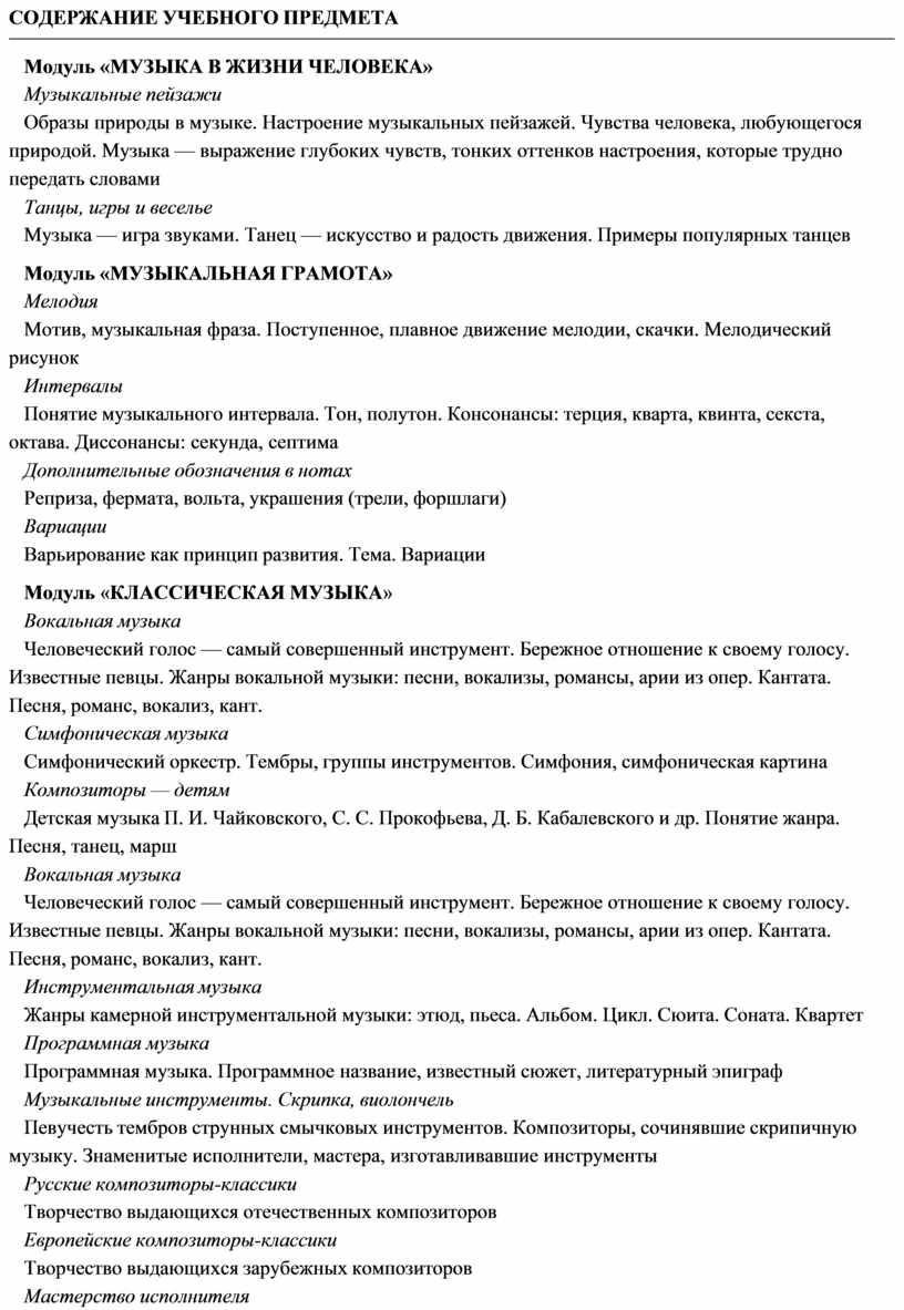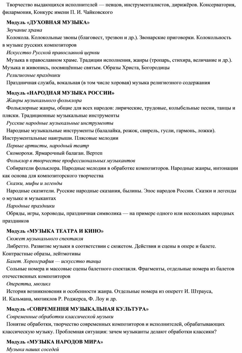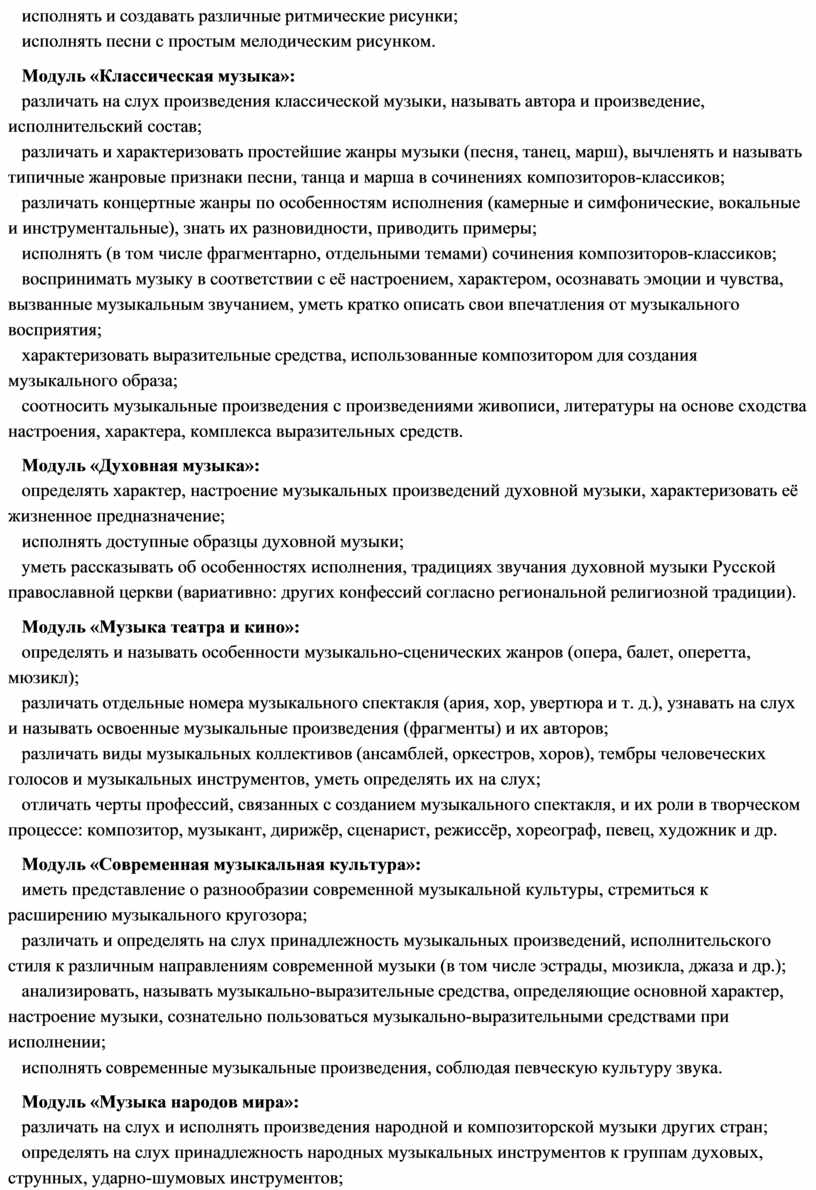 модуль № 1 «Музыкальная грамота»; модуль № 2 «Народная музыка России»; модуль № 3 «Музыка народов мира»; модуль № 4 «Духовная музыка»; модуль № 5 «Классическая музыка»;