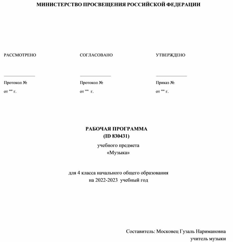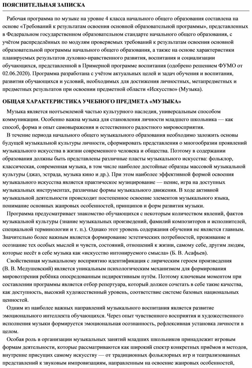 Рабочая программа по музыке на уровне 4 класса начального общего образования составлена на основе «Требований к результатам освоения основной образовательной программы», представленных в Федеральном государственном образовательном стандарте начального общего образования, с учётом распределённых по модулям проверяемых требований к результатам освоения основной образовательной программы начального общего образования, а также на основе характеристики планируемых результатов духовно-нравственного развития, воспитания и социализации обучающихся, представленной в Примерной программе воспитания (одобрено решением ФУМО от 02.06.2020). Программа разработана с учётом актуальных целей и задач обучения и воспитания, развития обучающихся и условий, необходимых для достижения личностных, метапредметных и предметных результатов при освоении предметной области «Искусство» (Музыка).