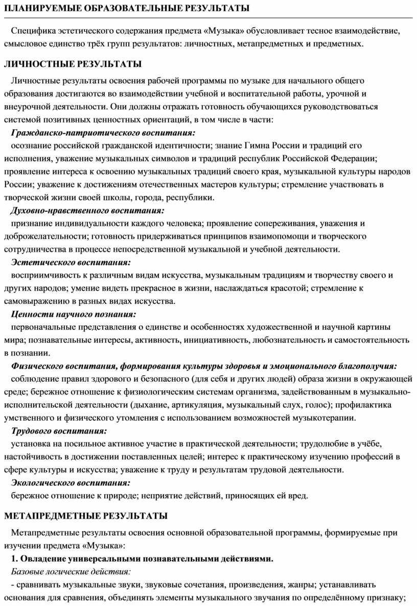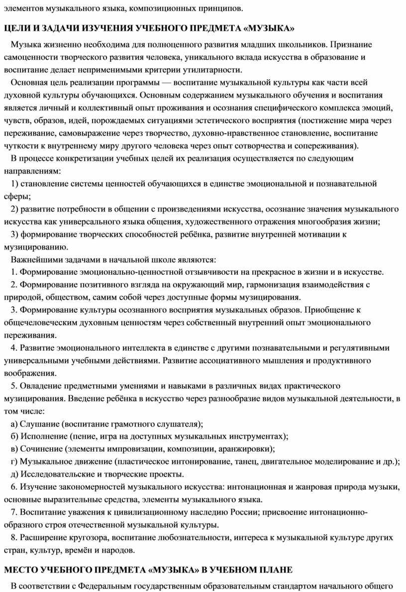 В течение периода начального общего музыкального образования необходимо заложить основы будущей музыкальной культуры личности, сформировать представления о многообразии проявлений музыкального искусства в жизни современного человека и общества. Поэтому в содержании образования должны быть представлены различные пласты музыкального искусства: фольклор, классическая, современная музыка, в том числе наиболее достойные образцы массовой музыкальной культуры (джаз, эстрада, музыка кино и др.). При этом наиболее эффективной формой освоения музыкального искусства является практическое музицирование — пение, игра на доступных музыкальных инструментах, различные формы музыкального движения. В ходе активной музыкальной деятельности происходит постепенное освоение элементов музыкального языка, понимание основных жанровых особенностей, принципов и форм развития музыки.