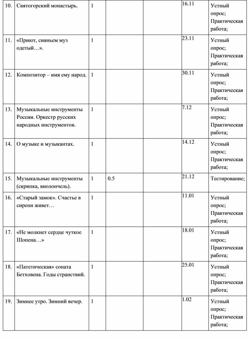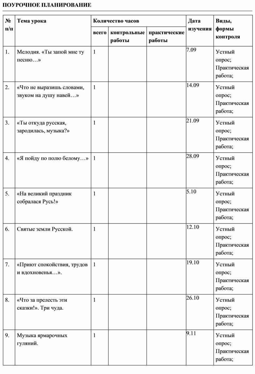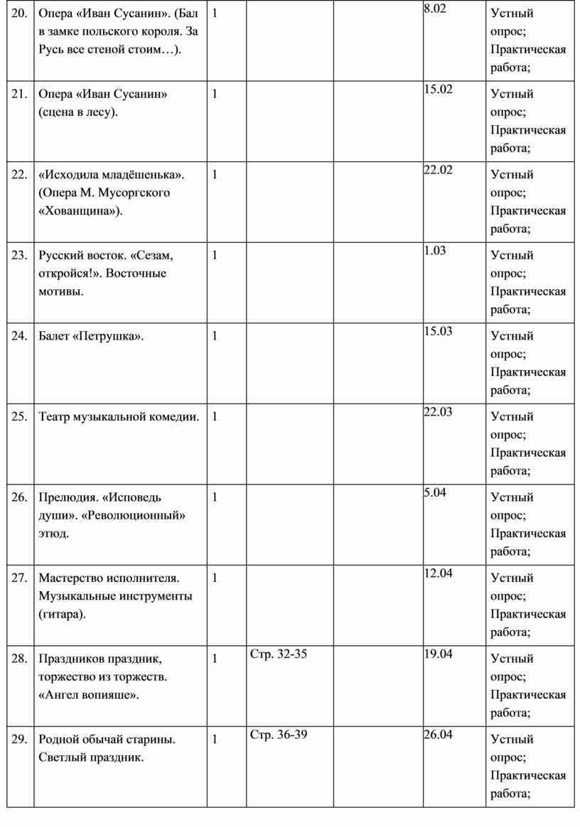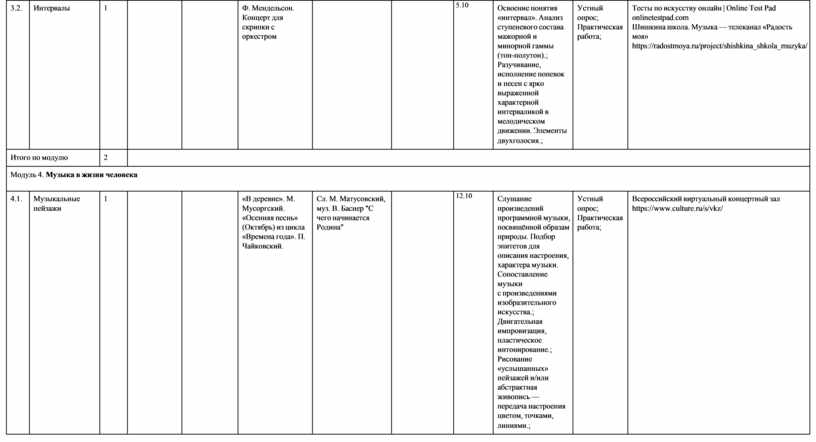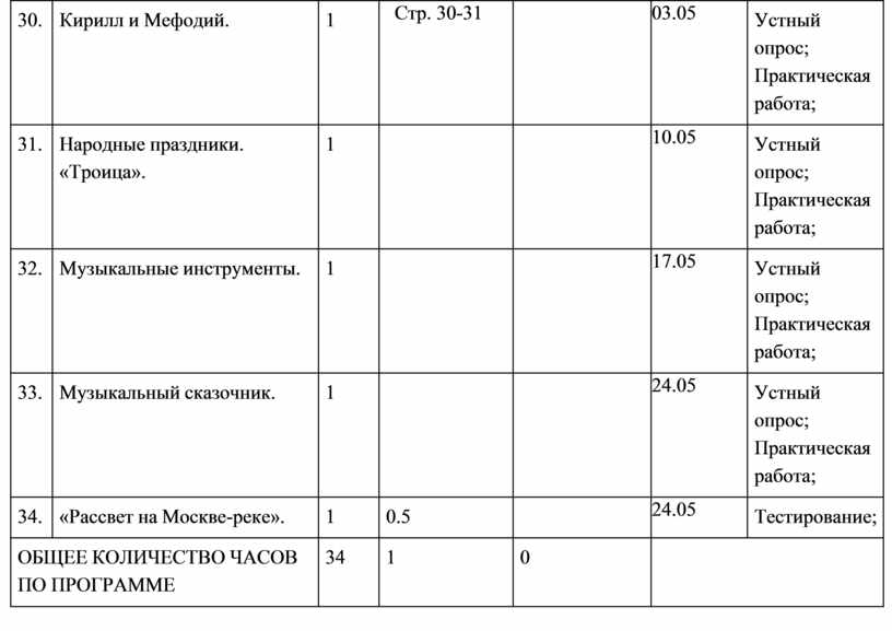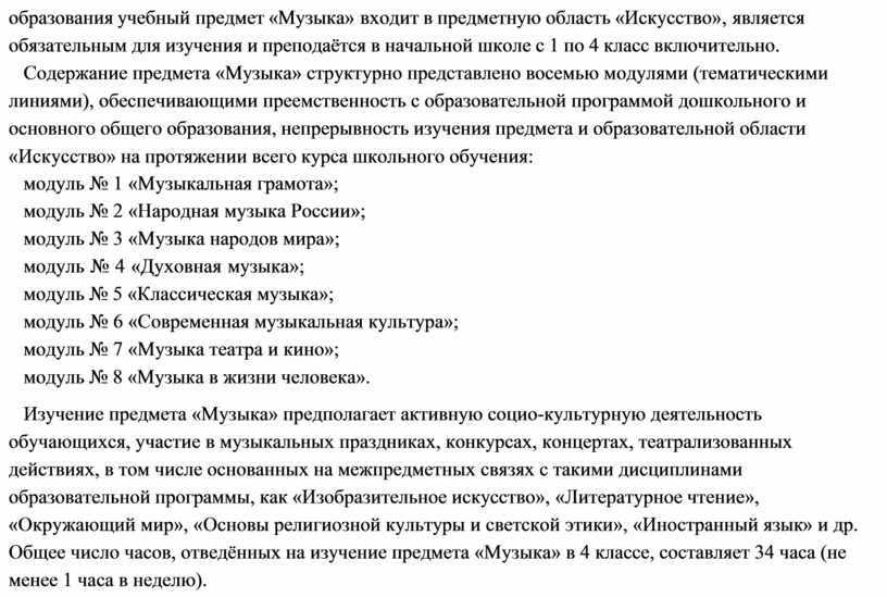 «Окружающий мир», «Основы религиозной культуры и светской этики», «Иностранный язык» и др. Общее число часов, отведённых на изучение предмета «Музыка» в 4 классе, составляет 34 часа (не менее 1 часа в неделю).