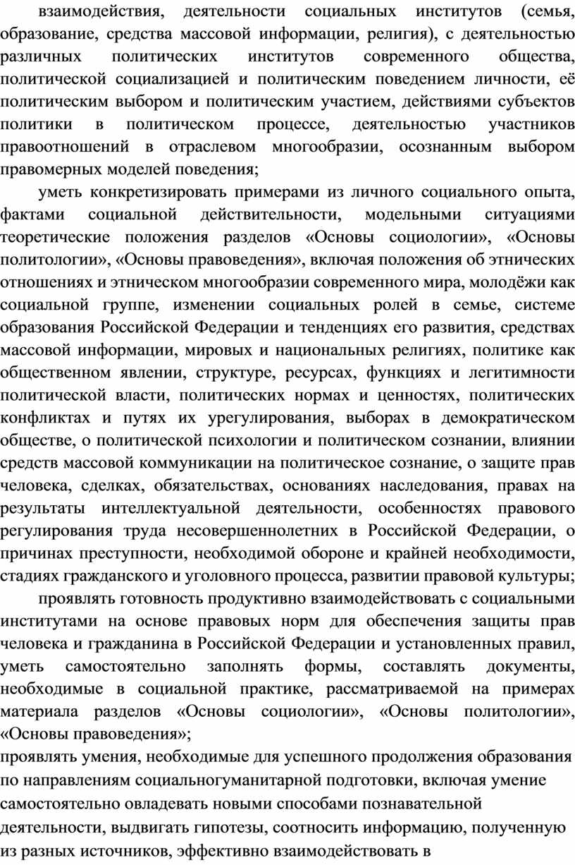 Обществознание выполняет ведущую роль в реализации функции интеграции молодёжи в современное общество, направляет и обеспечивает условия формирования российской гражданской идентичности, освоения традиционных ценностей многонационального российского народа, социализации обучающихся, их готовности к саморазвитию и непрерывному образованию, труду и творческому самовыражению, правомерному поведению и взаимодействию с другими людьми в процессе решения задач личной и социальной значимости.