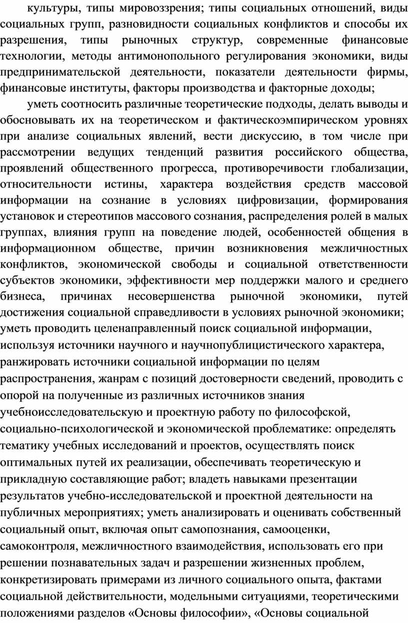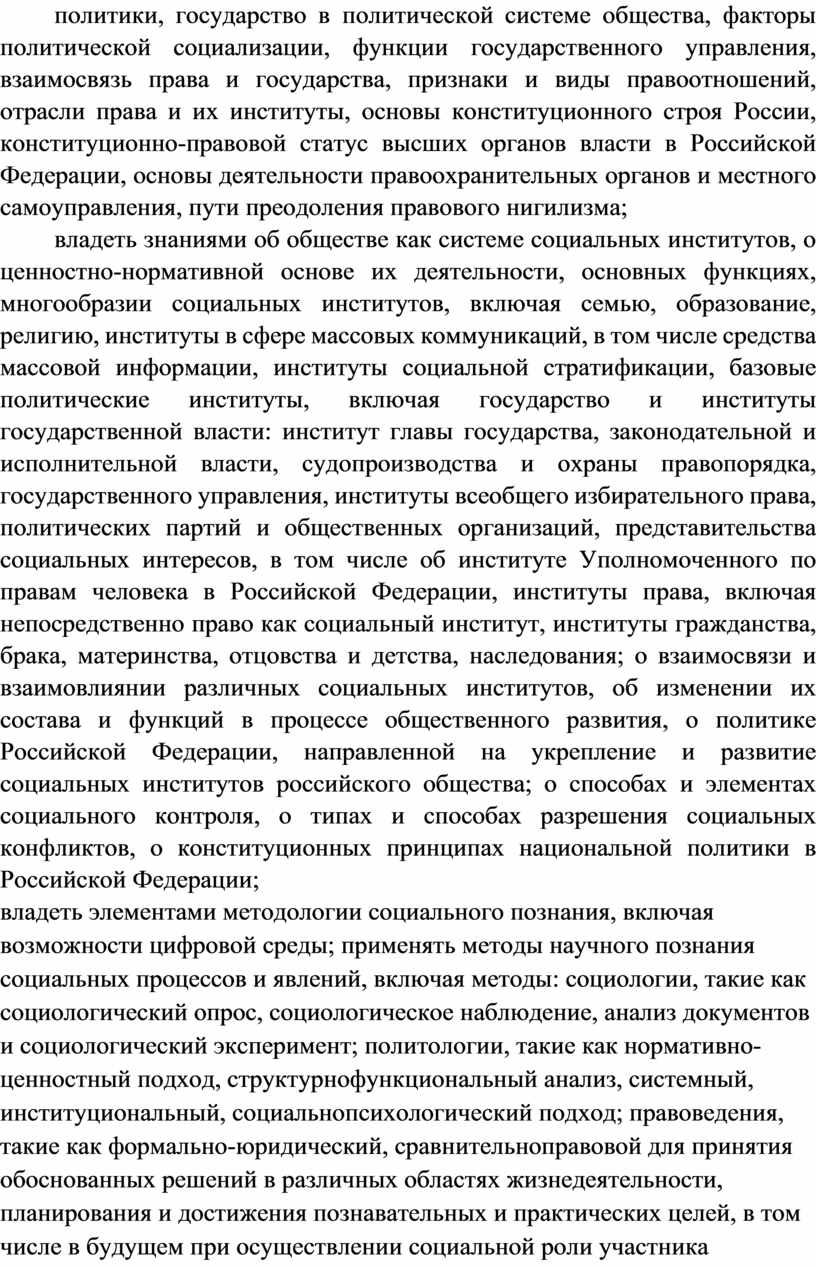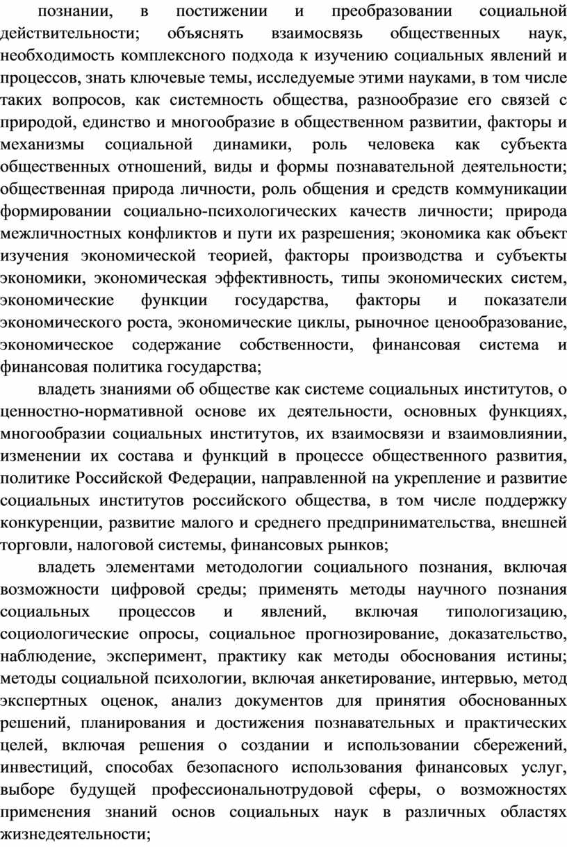 освоение системы знаний, опирающейся на системное изучение основ базовых для предмета социальных наук, изучающих особенности и противоречия современного общества, его социокультурное многообразие, единство социальных сфер и институтов, человека как субъекта социальных отношений, многообразие видов деятельности людей и регулирование общественных отношений;