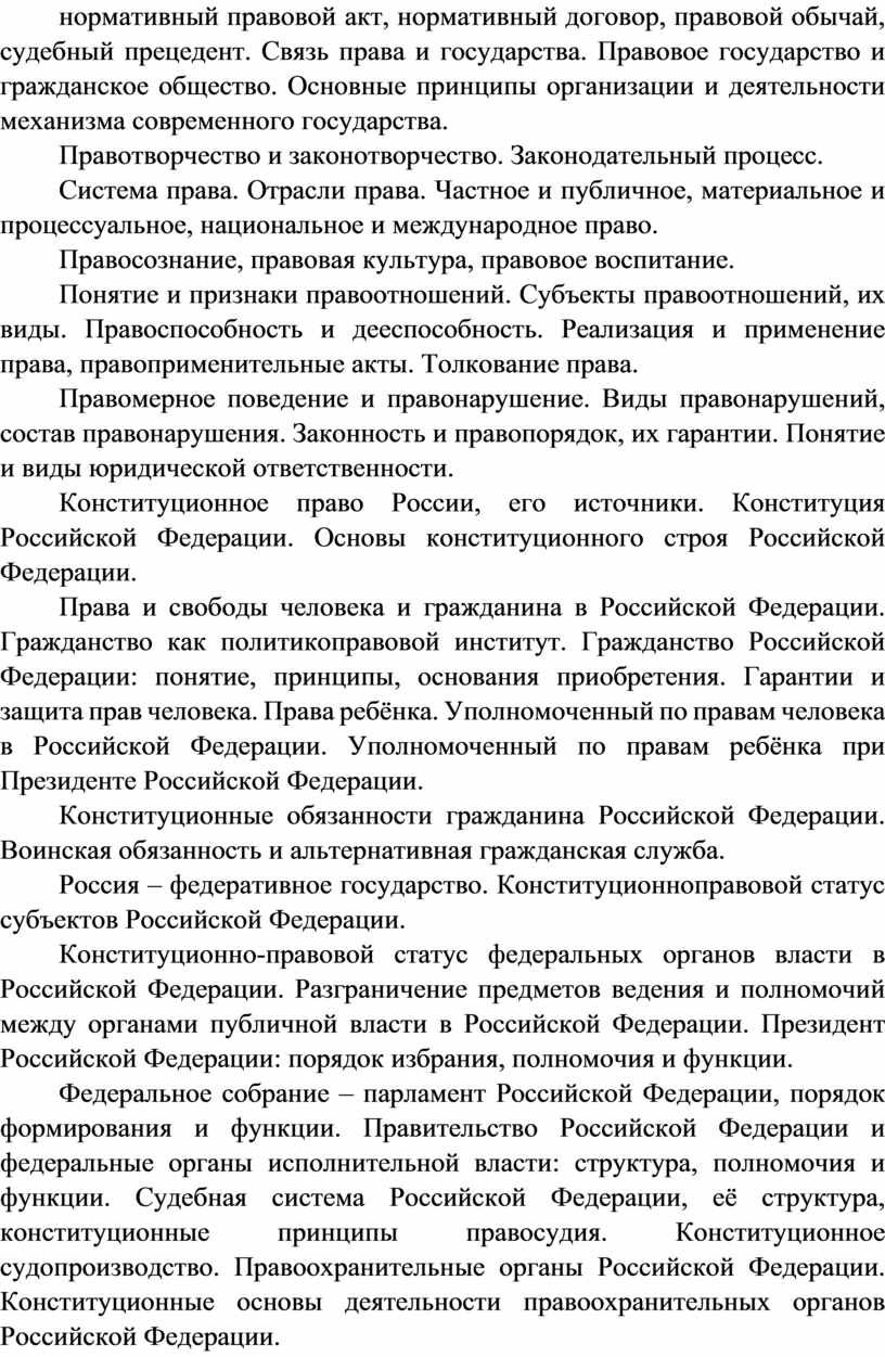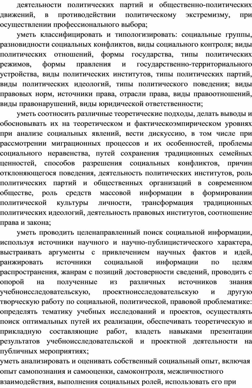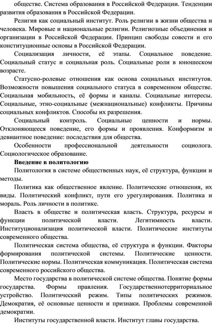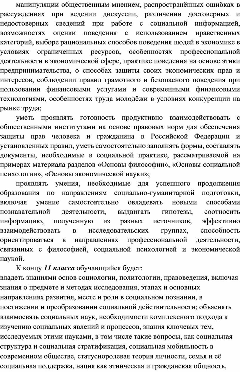 Содержание учебного предмета ориентируется на систему теоретических знаний, традиционные ценности российского общества, представленные на базовом уровне, и обеспечивает преемственность по отношению к обществоведческому курсу уровня основного общего образования путём углублённого изучения ряда социальных процессов и явлений. Наряду с этим вводится ряд новых, более сложных компонентов содержания, включающих знания, социальные навыки, нормы и принципы поведения людей в обществе, правовые нормы, регулирующие отношения людей во всех областях жизни.