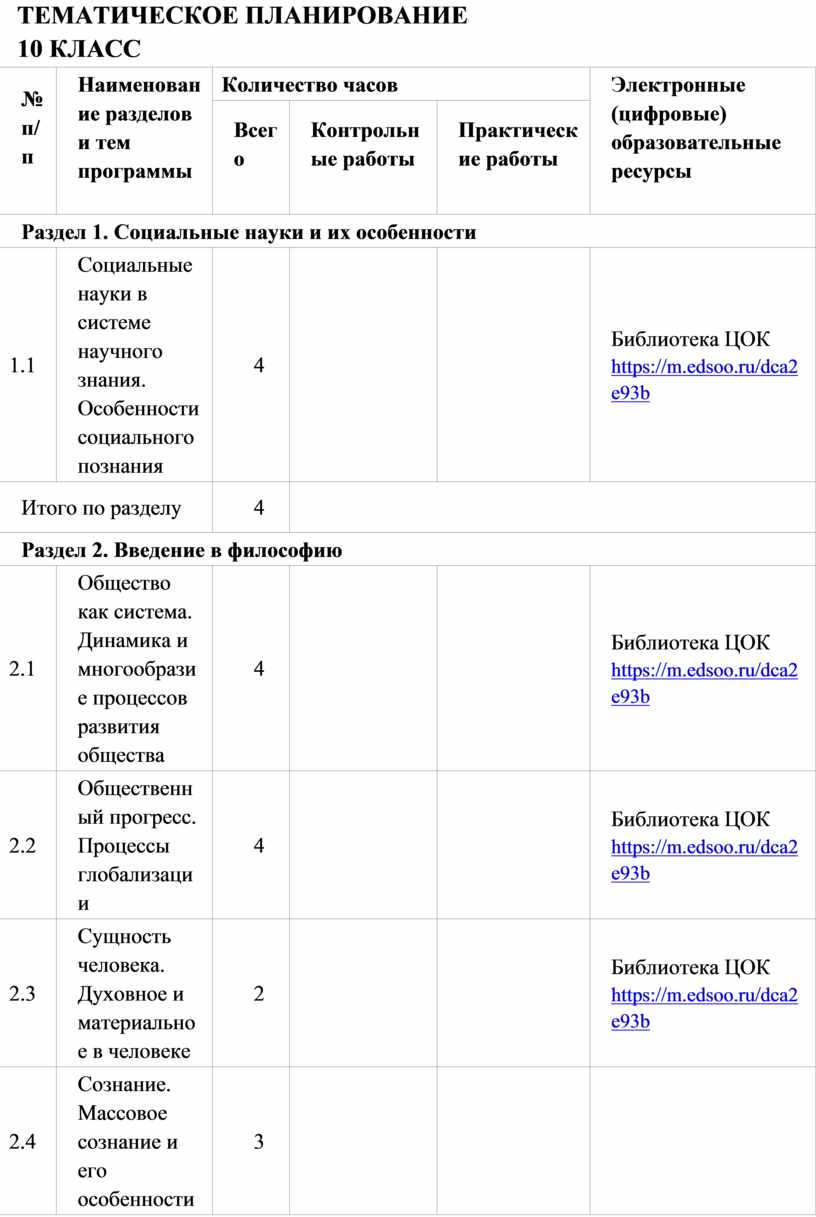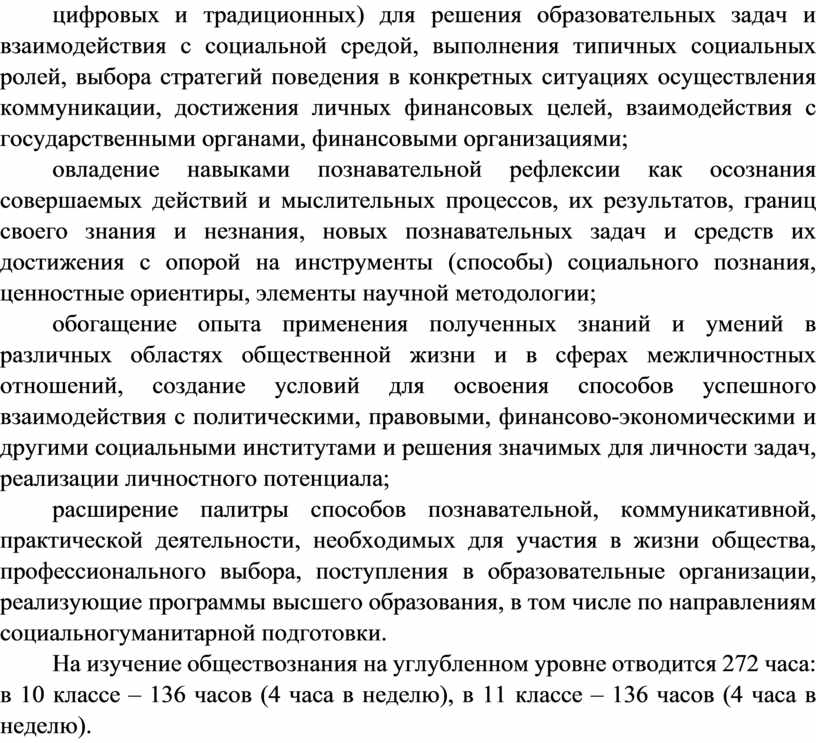На изучение обществознания на углубленном уровне отводится 272 часа: в 10 классе – 136 часов (4 часа в неделю), в 11 классе – 136 часов (4 часа в неделю).